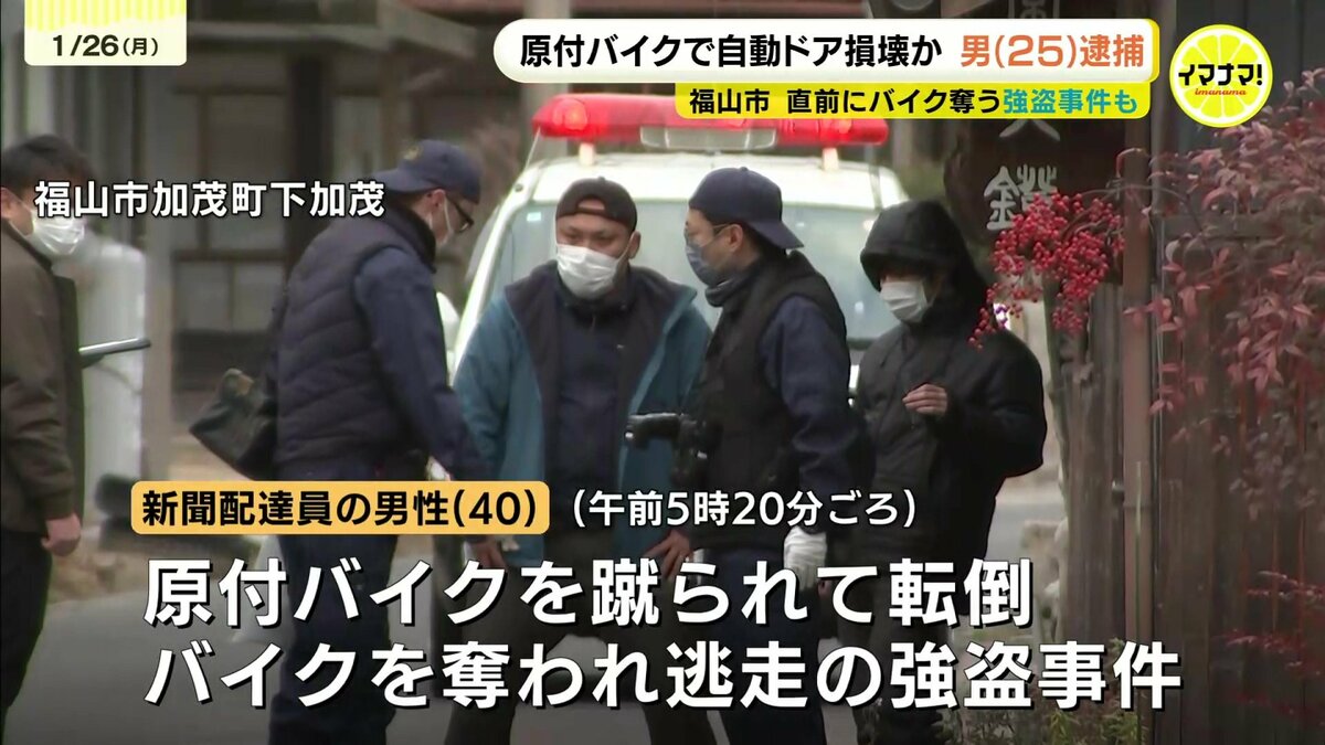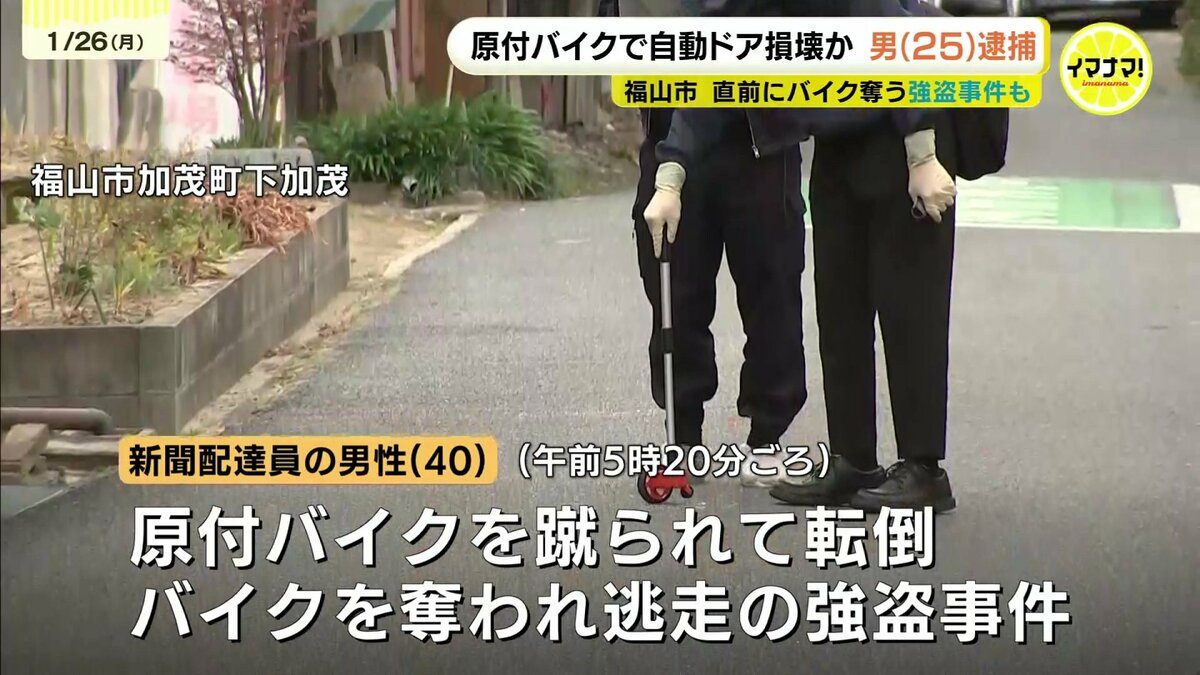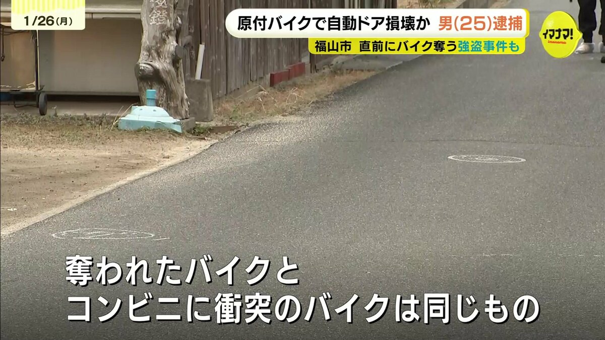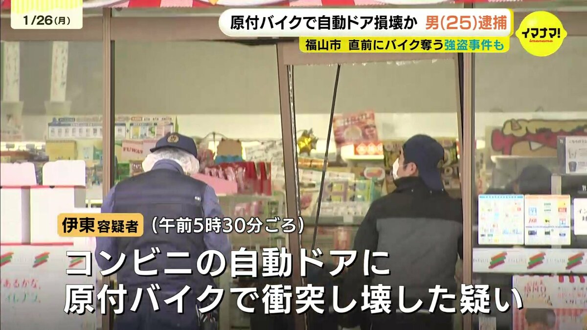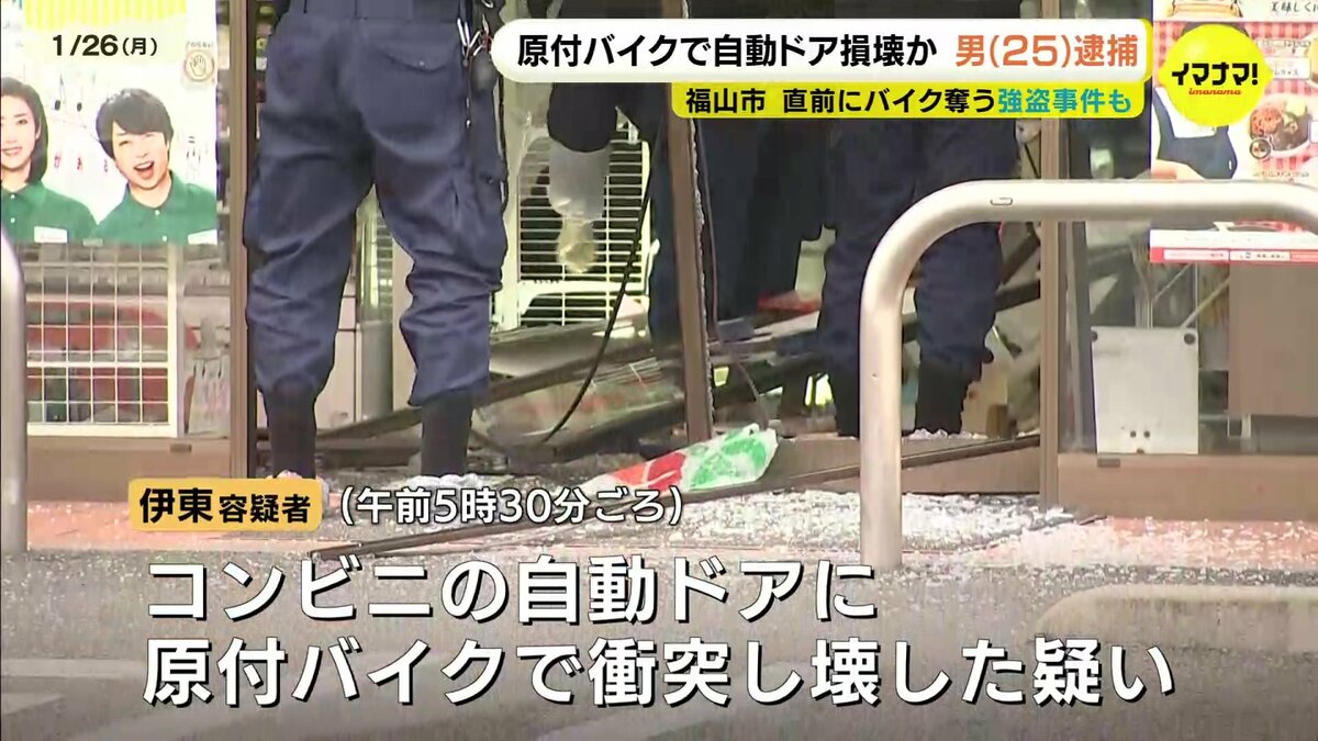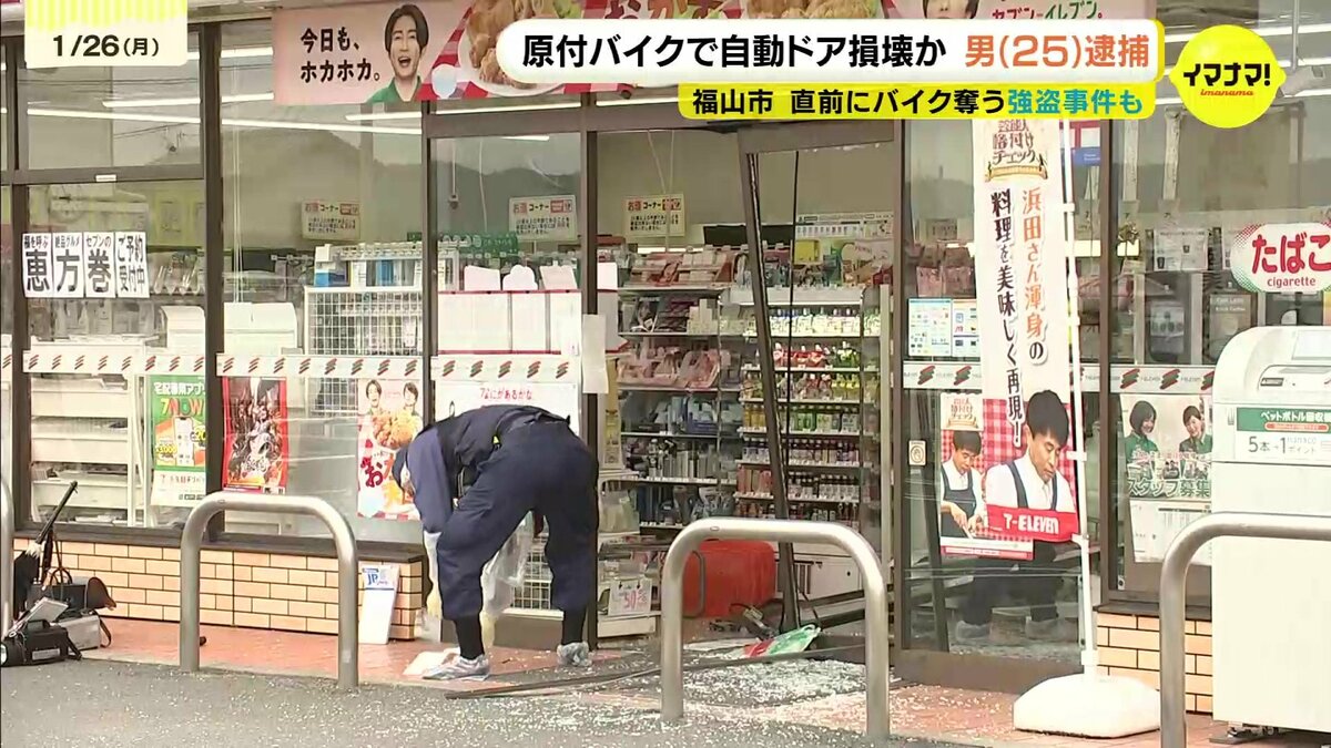 26日朝早く、福山市のコンビニで、自動ドアに原付バイクを衝突させて壊したとして、25歳の男が逮捕されました。直前には、バイクが奪われる強盗事件も起きていて警察が関連を調べています。