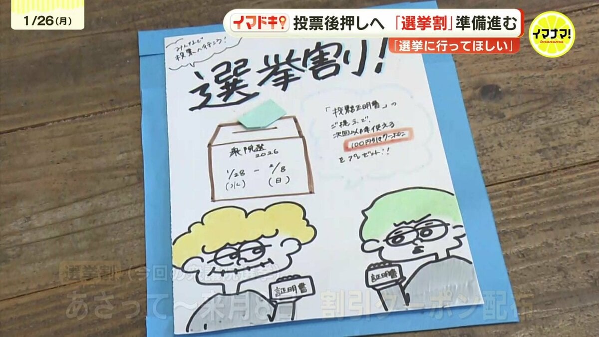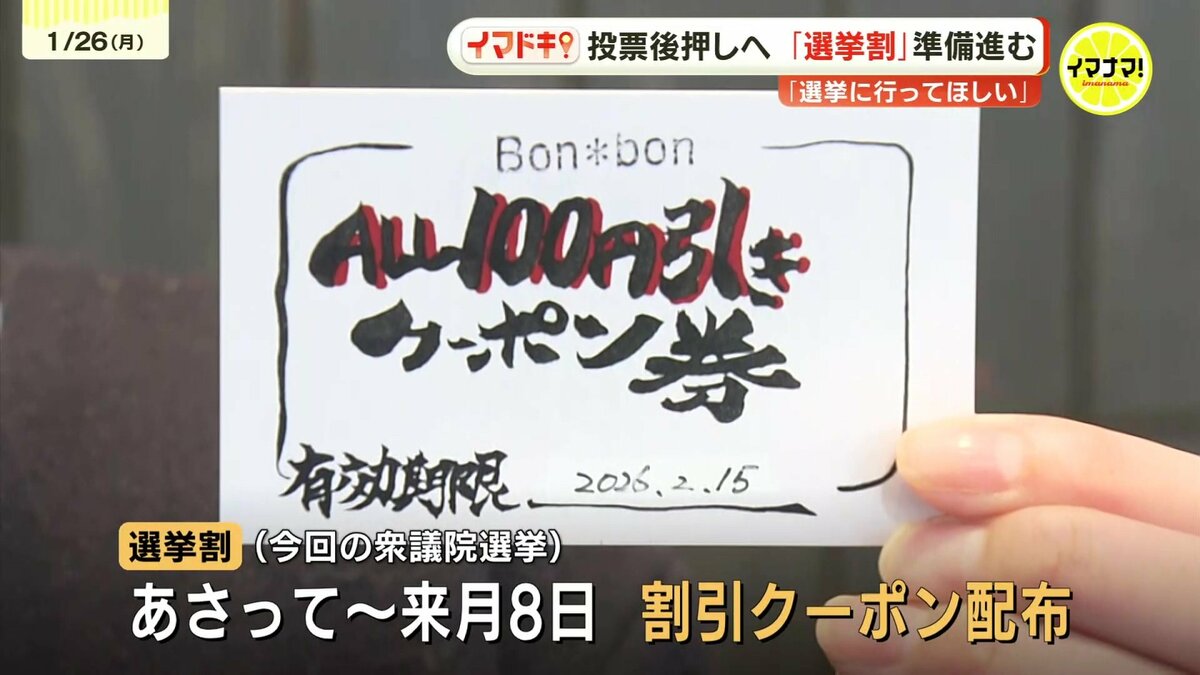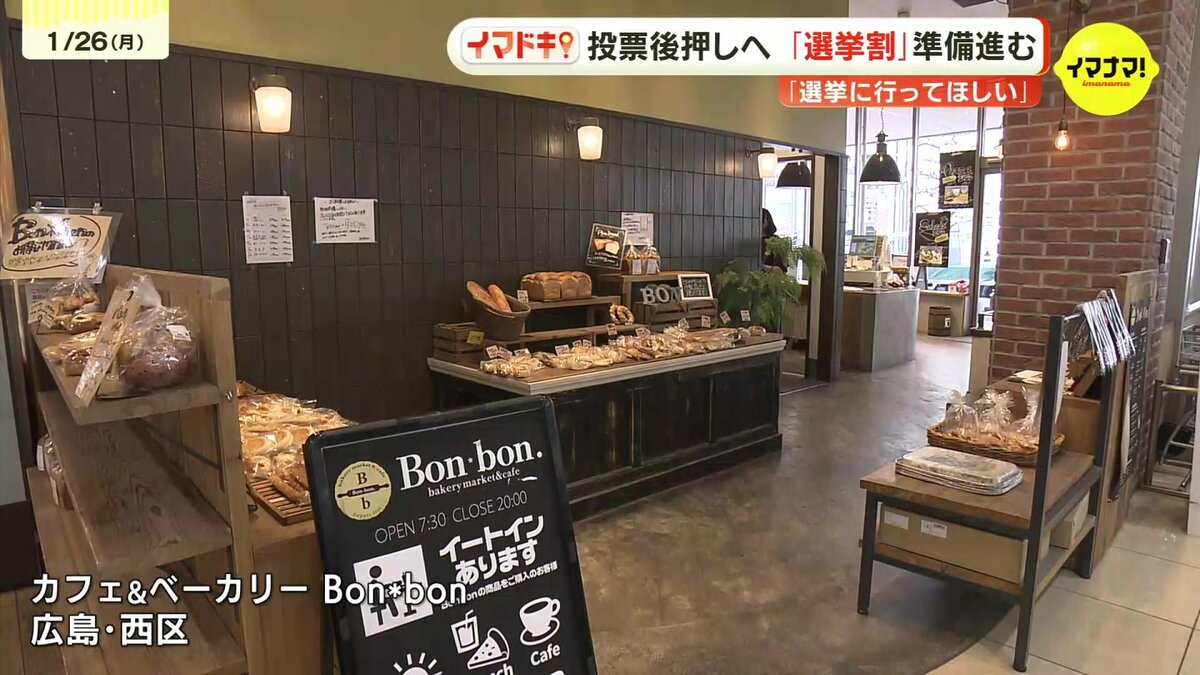 広島市西区のカフェ&ベーカリーBon*bonでは、2025年の参議院選挙から、100円引きのクーポンを配布する「選挙割」に取り組んできました。今回の衆議院選挙でも、1月28日から2月8日まで、割引クーポンを配布する予定です。