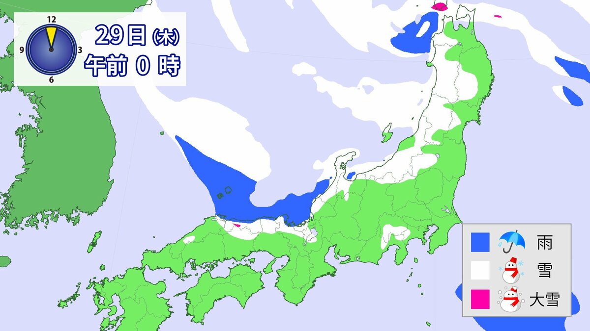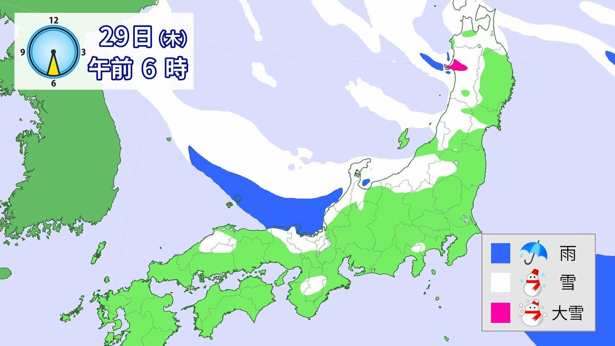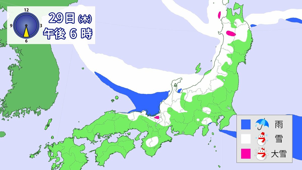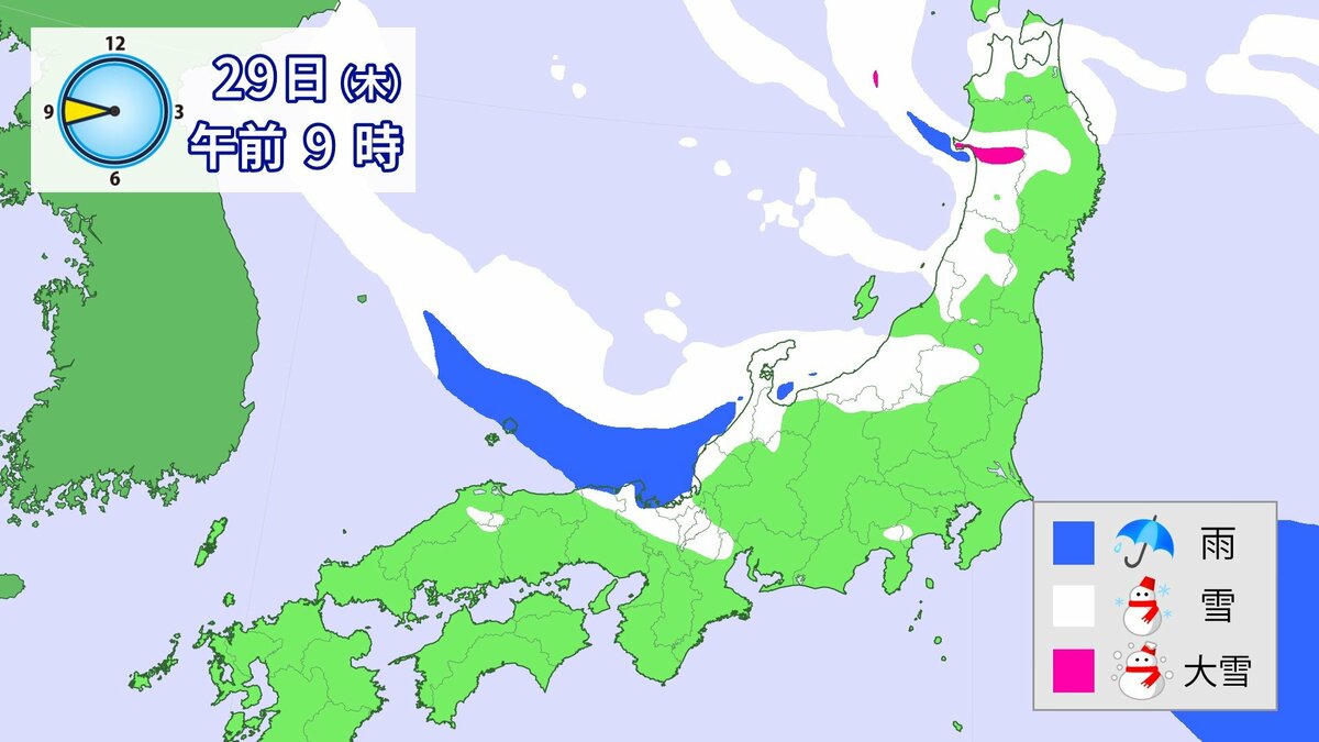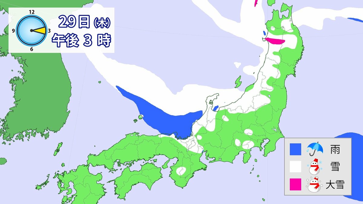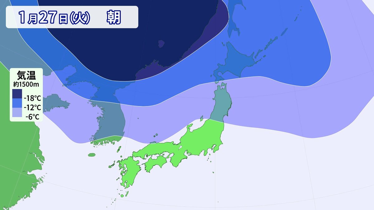 全国各地で大雪をもたらした、長い居座り寒波がようやくおさまり、27日(火)は上空の寒気が比較的緩んでいます。ただ、28日(水)の午後からは次第に寒気が強まり、29日(木)以降は、日本海側で再び大雪となる可能性があります。上空1500m付近の寒気を見ると、29日(木)は平地で雪を降らせる目安の-6℃以下の寒気が、日本の南岸まですっぽり覆っています。