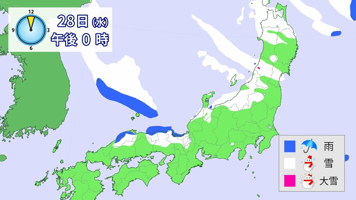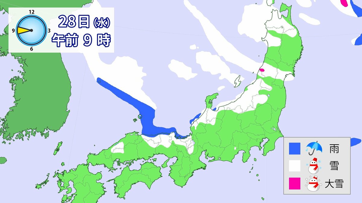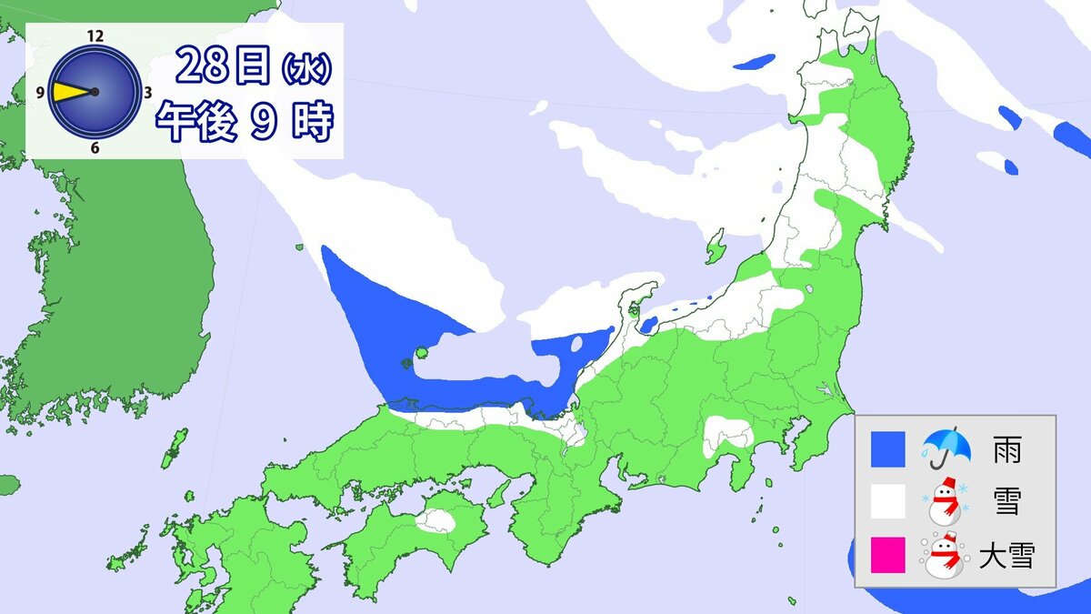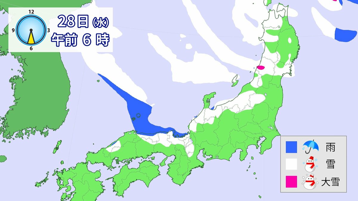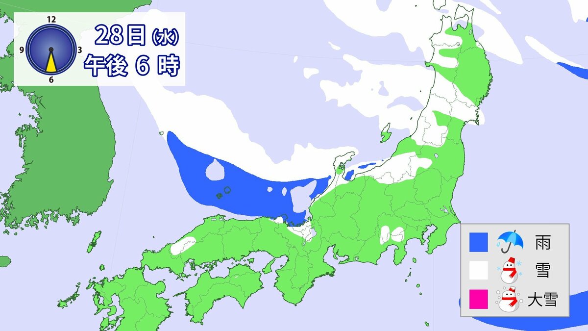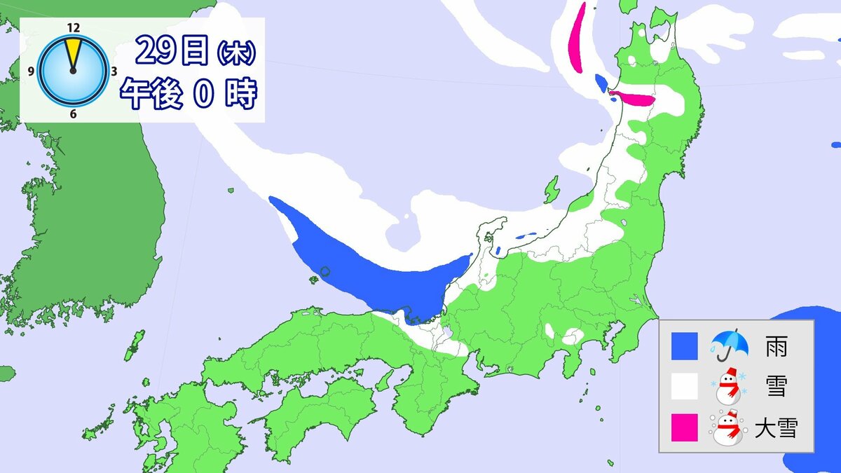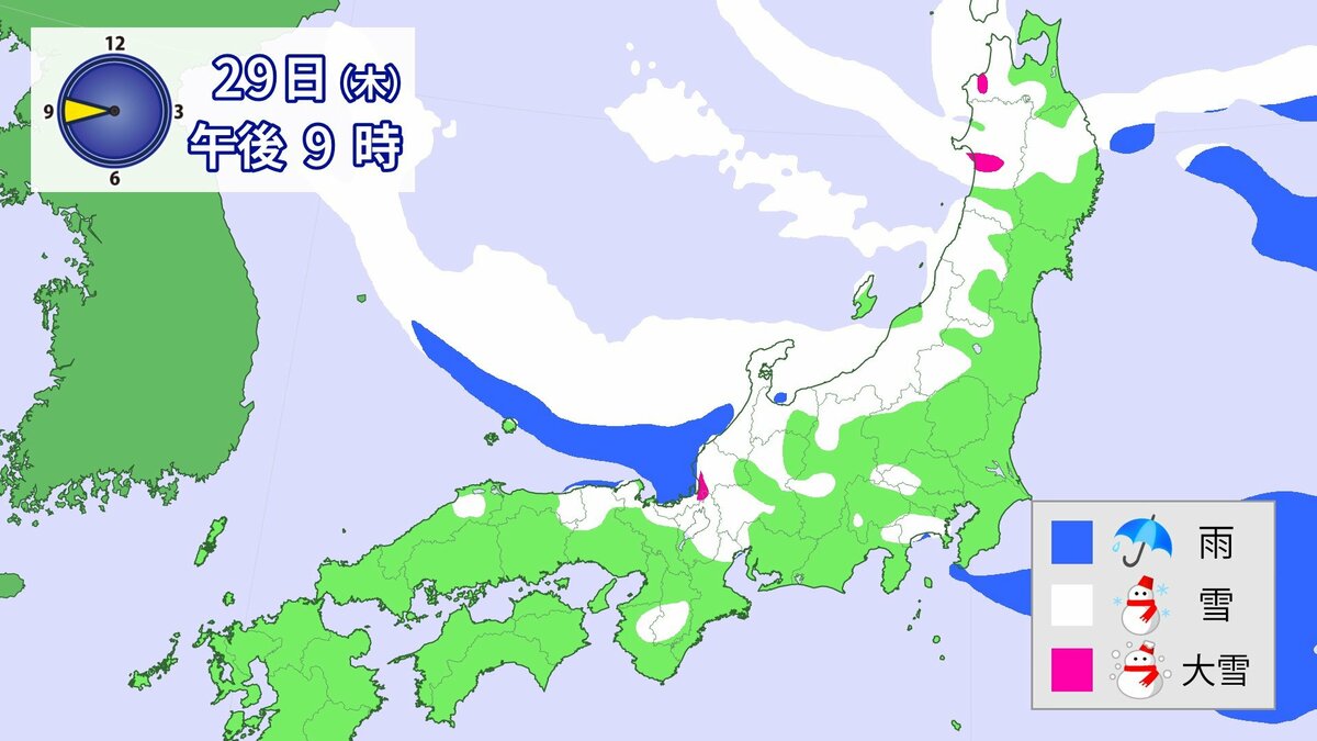 全国各地で大雪をもたらした、長い居座り寒波がようやくおさまり、27日(火)は上空の寒気が比較的緩んでいます。ただ、28日(水)の午後からは次第に寒気が強まり、29日(木)以降は、日本海側で再び大雪となる可能性があります。上空1500m付近の寒気を見ると、29日(木)は平地で雪を降らせる目安の-6℃以下の寒気が、日本の南岸まですっぽり覆っています。
