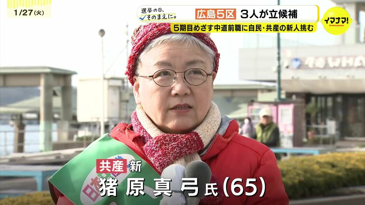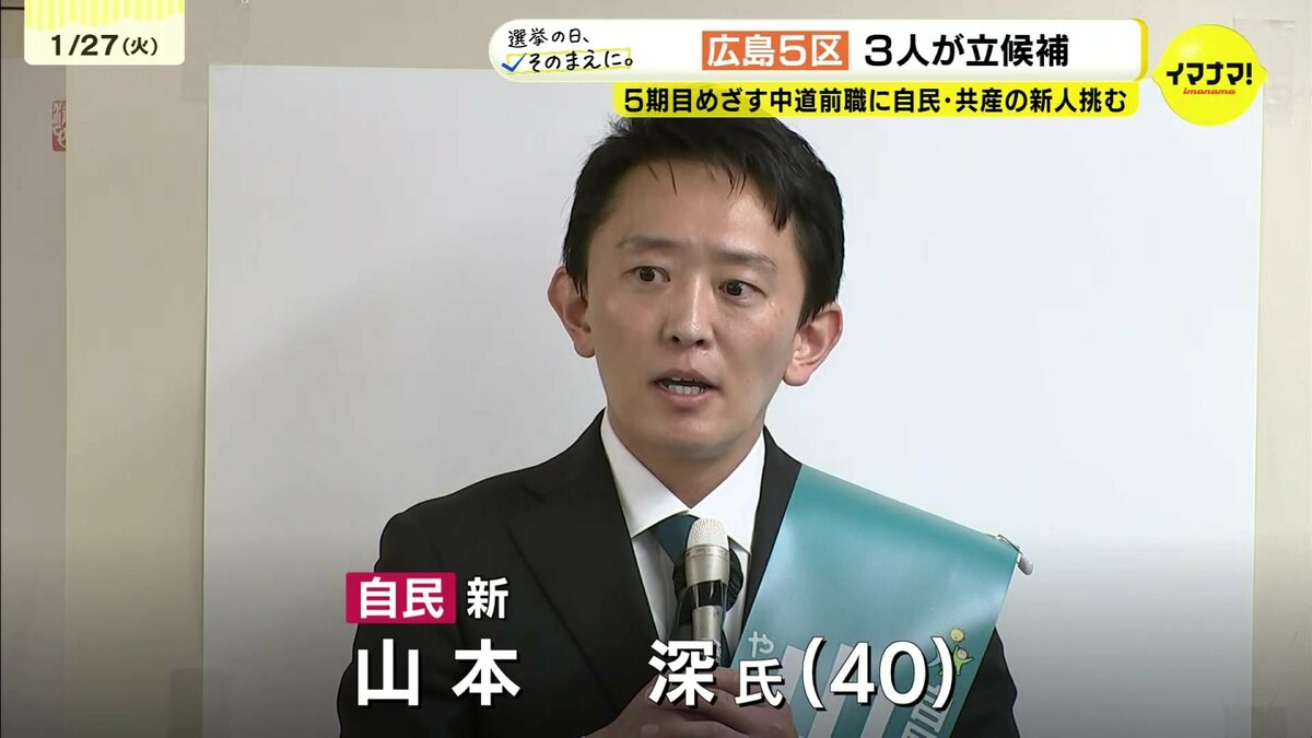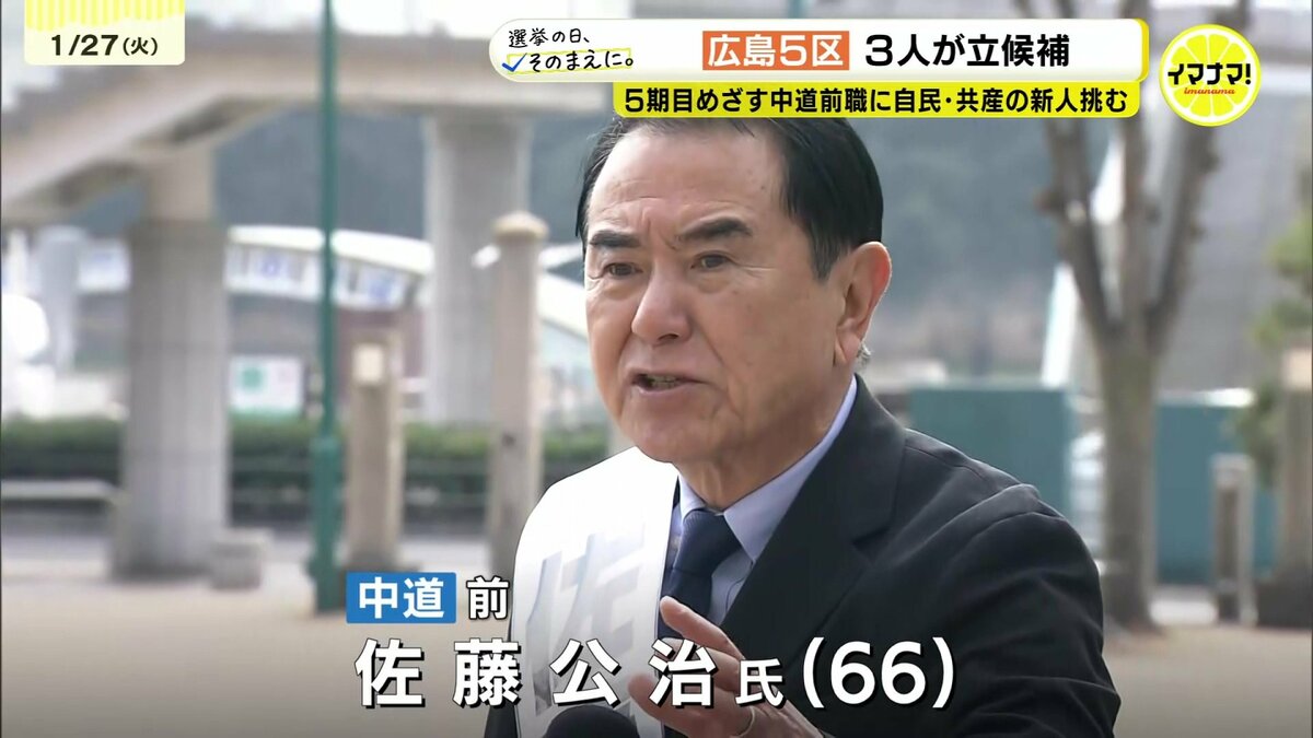 広島5区は、5期目をめざす中道の前職に対し、自民が公示直前に新たな候補者を擁立しました。共産の新人も含め、あわせて3人が争います。