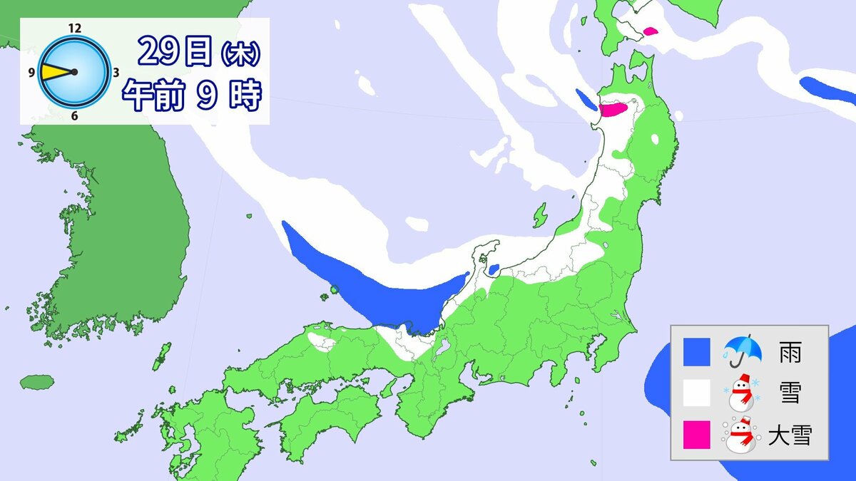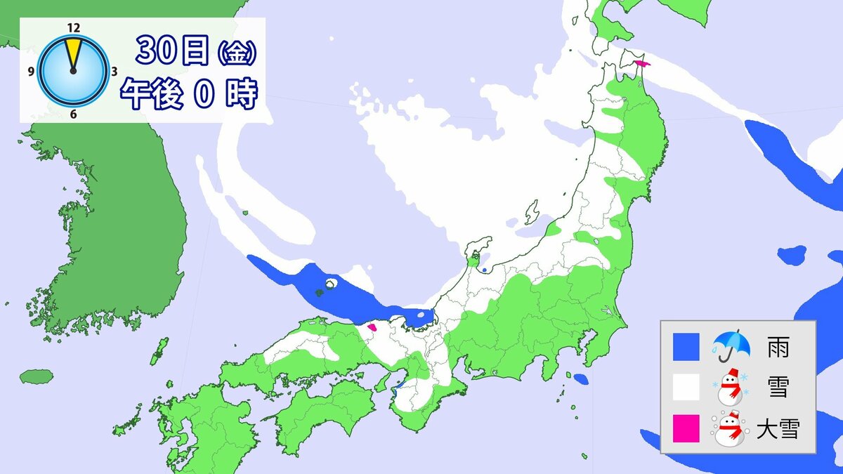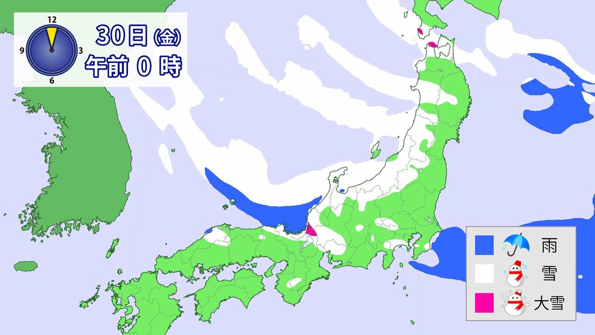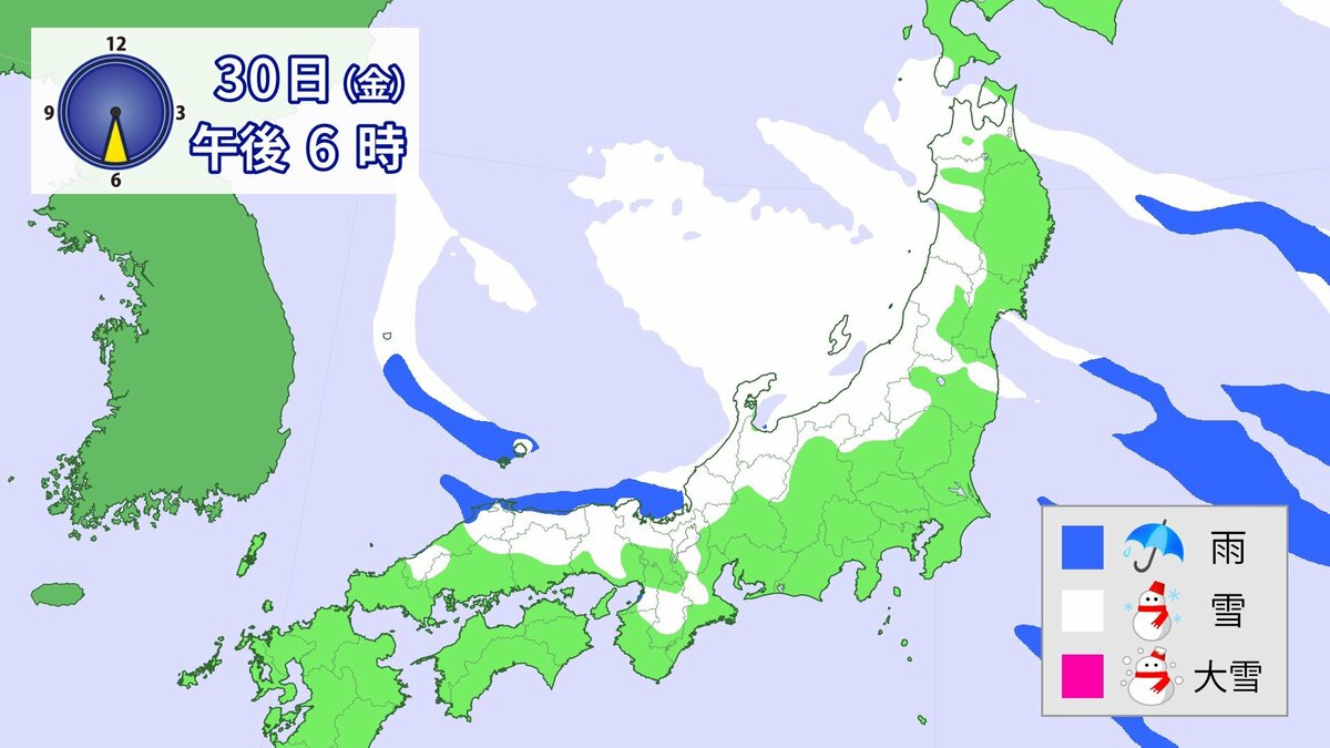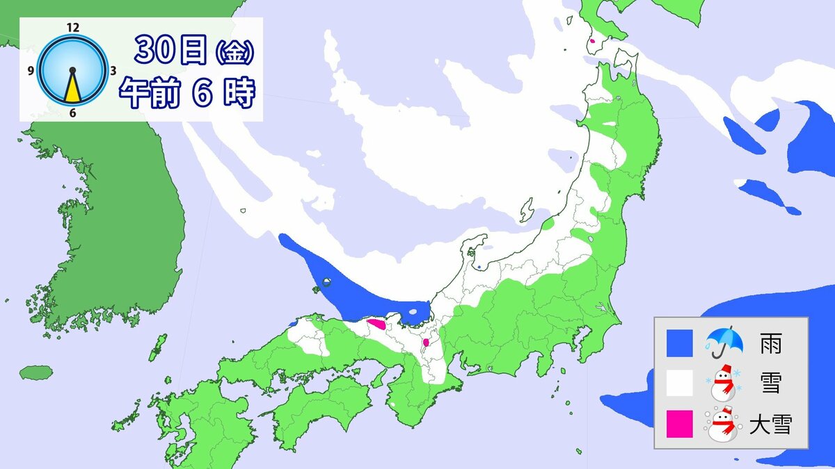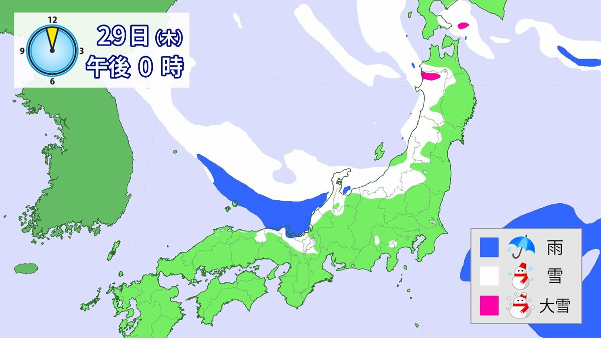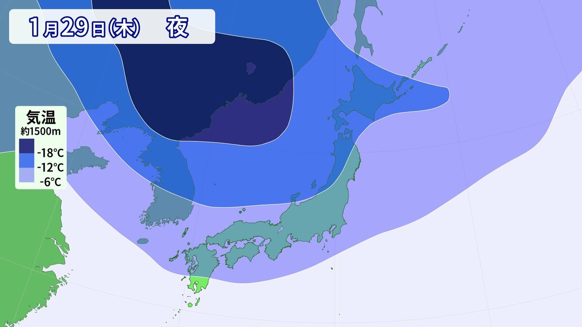 気象庁によりますと、日本付近は29日から30日頃にかけて強い冬型の気圧配置となり、北陸地方の上空約5500mには-36℃以下の強い寒気が流れ込むでしょう。