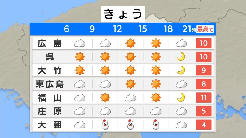 上空には寒気が入っているため、県内は雲が広がりやすく、北部では雪が降るところがあるでしょう。南部には日差しが届く時間もありそうです。最高気温は、広島・呉10℃、福山11℃、庄原5℃の予想、きのうと同じくらいで、ほぼ平年並みの見込みです。冬型の気圧配置が続き、県沿岸部ではかなり空気が乾燥しています。火の取り扱いには十分ご注意ください。
