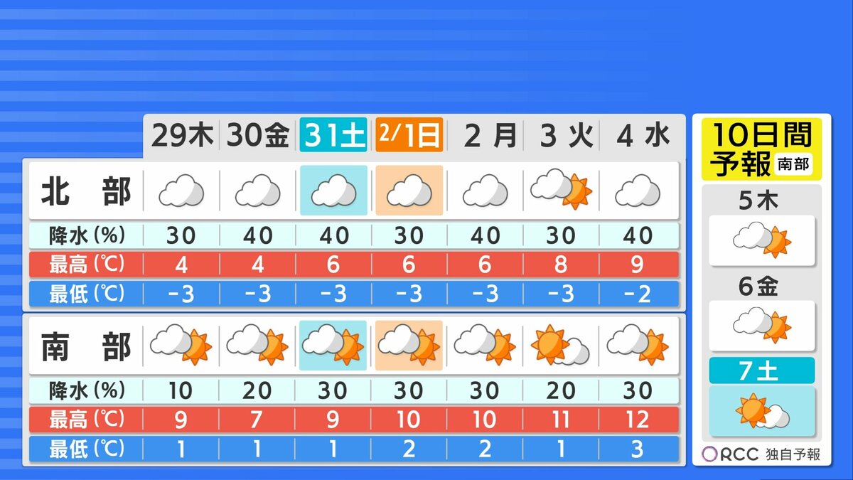 しばらく南部では晴れ間の広がる日が続きますが、金曜日にかけて強い寒気が流れ込んだ状態が続きます。北部を中心に雪が降り、南部でもちらつく所があるでしょう。来週には日中の気温が徐々に高くなる予想です。