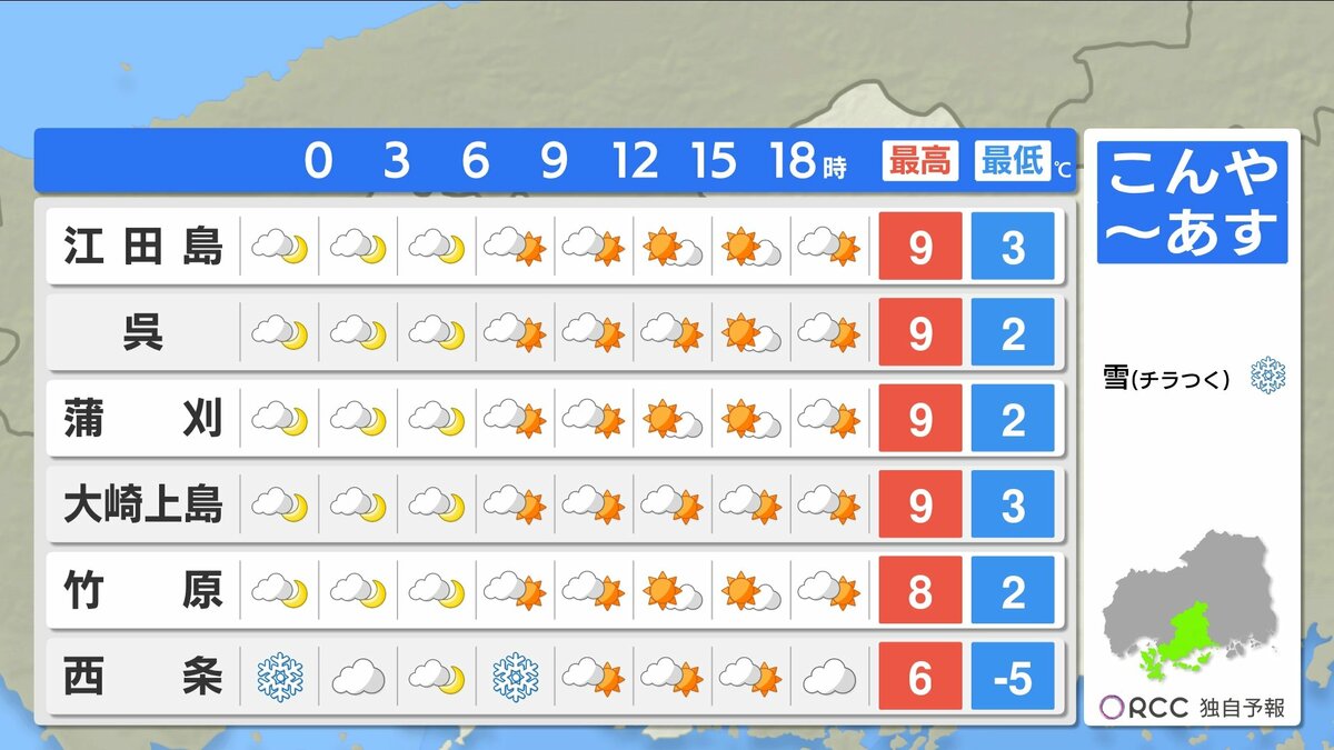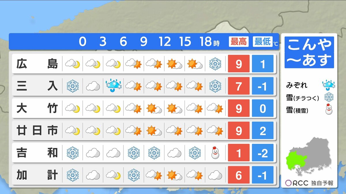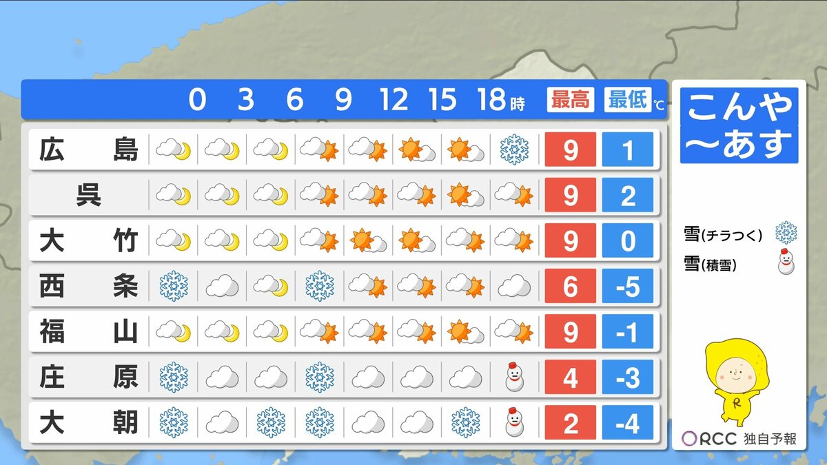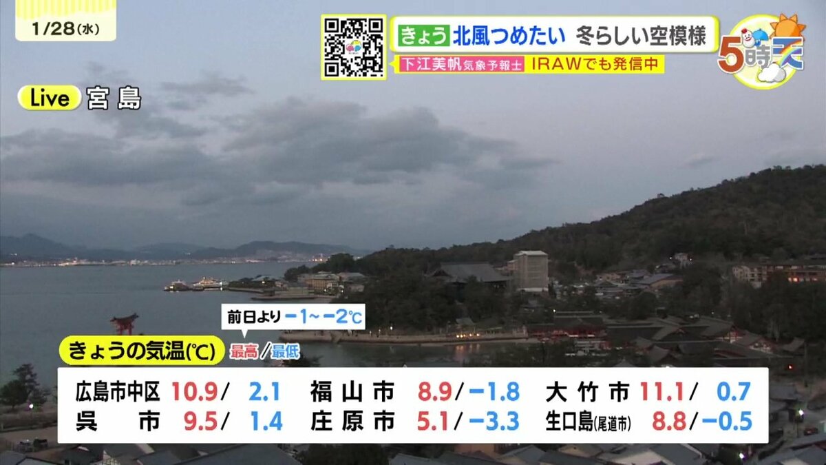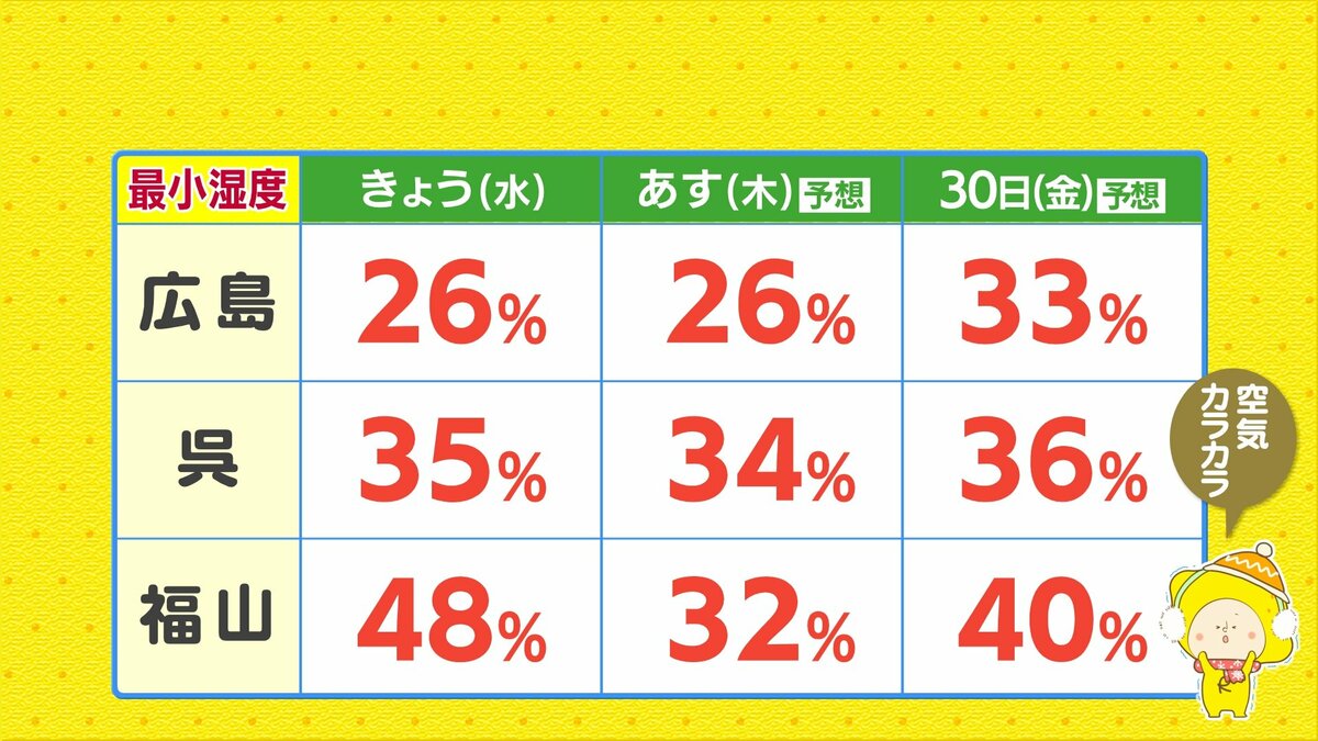 きょう28日(水)の広島県内は、午前中を中心に南部では晴れ間が広がりましたが、北部や内陸部では雪や雨が降りました。最高気温は、広島市中区10.9℃できのうよりやや低くなりました。広島市中区の最小湿度は26パーセントで、空気の乾燥状態が続いています。