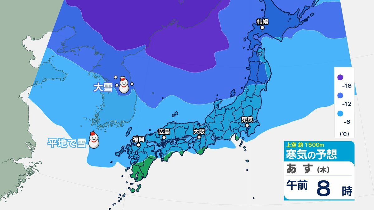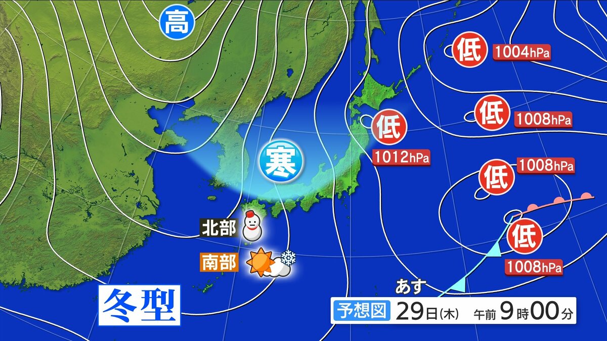引き続き冬型の気圧配置で、上空にはきょうよりもやや強い寒気が流れ込みます。北部では雪が降り、山地を中心に積雪する見込みです。南部では基本的に晴れ間が広がりますが、一部雪が舞ったり、みぞれが降るところがあるでしょう。