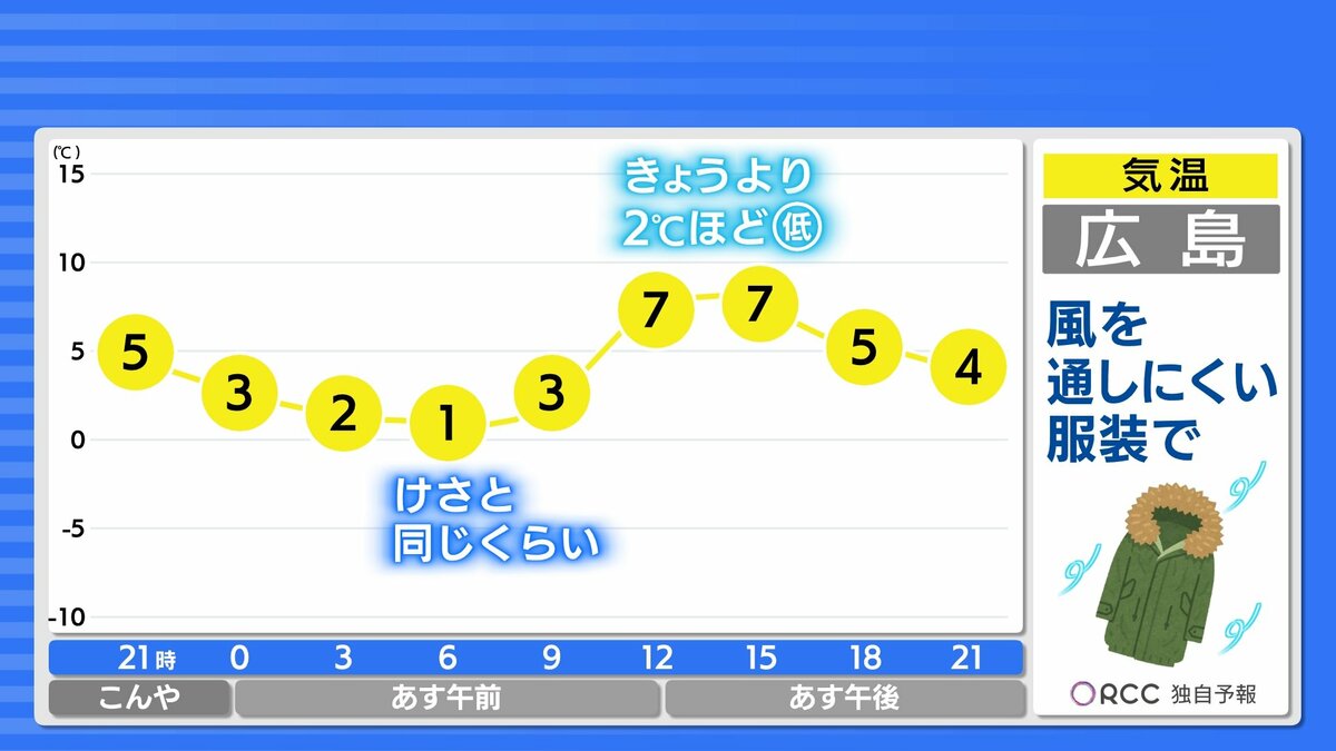 日中の気温は、きょうよりも2℃~3℃ほど低くなる所が多く、あすは風も強いのできょうよりも風が冷たく、寒くなります。防寒対策はきょう以上にしっかりなさってください。