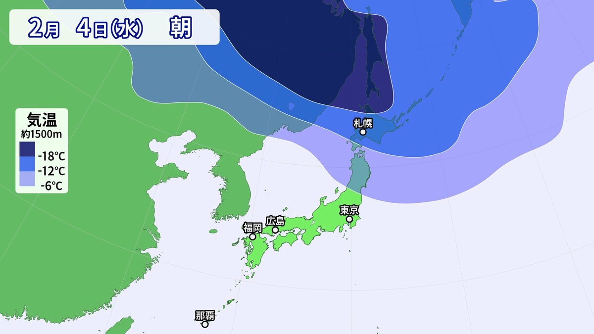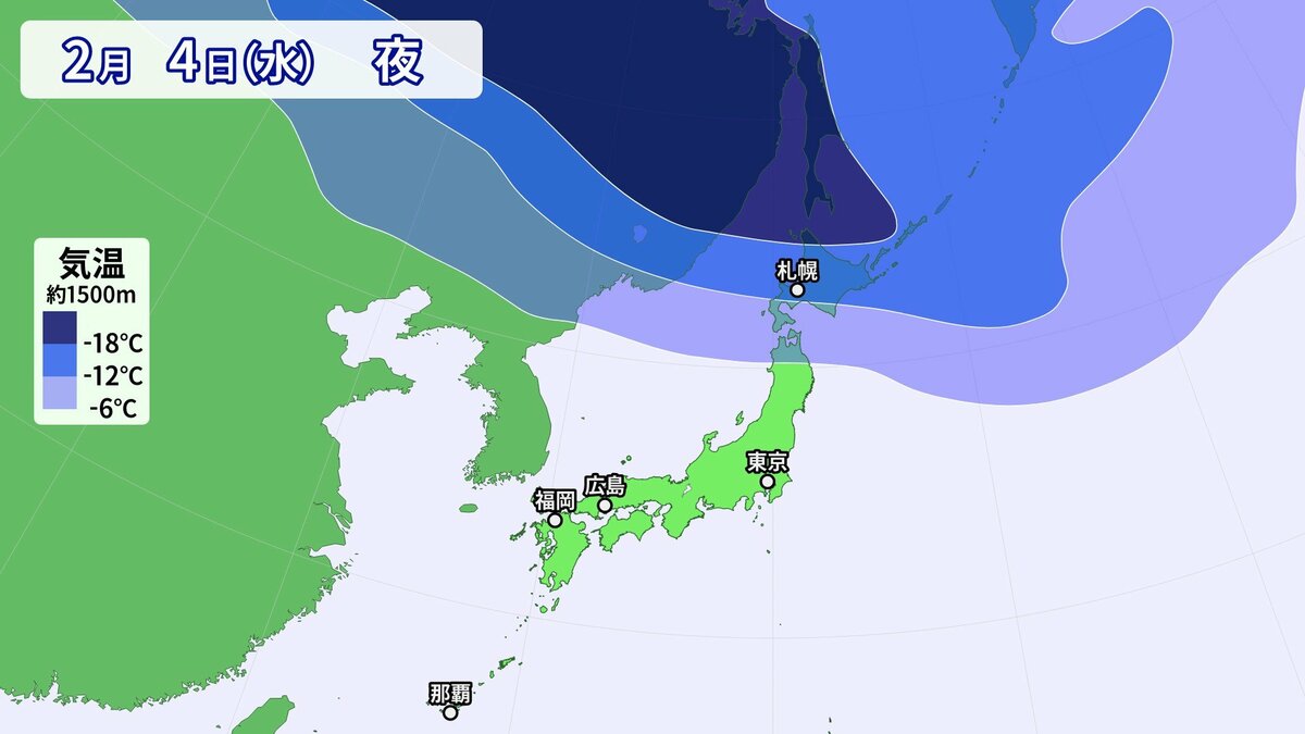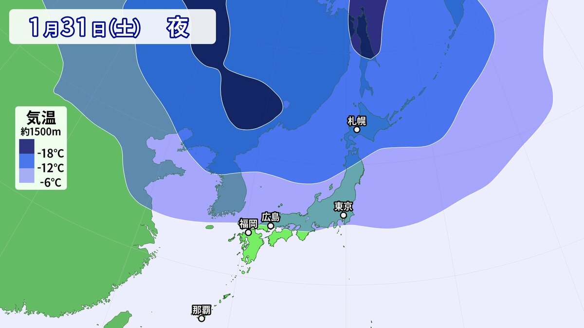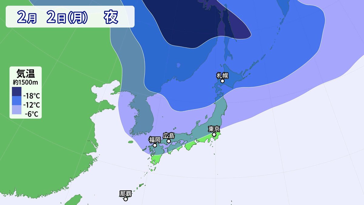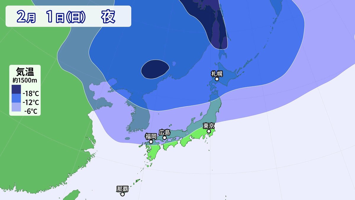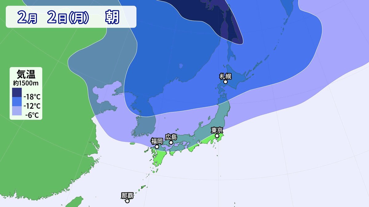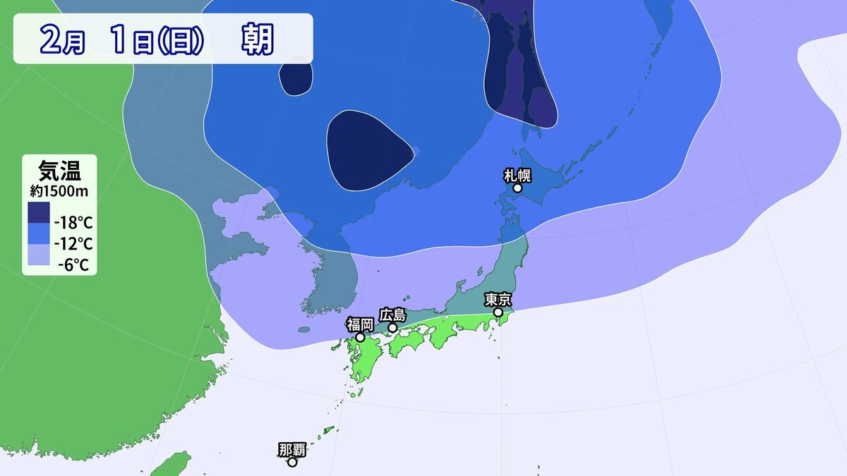 上空1500メートル付近の寒気の予想を見てみると、来週月曜日頃(2月2日)にかけて平地で雪を降らせる目安の寒気が本州付近にかかる見込みですが、その後いったん寒気は抜け、気温は上昇する予想です。