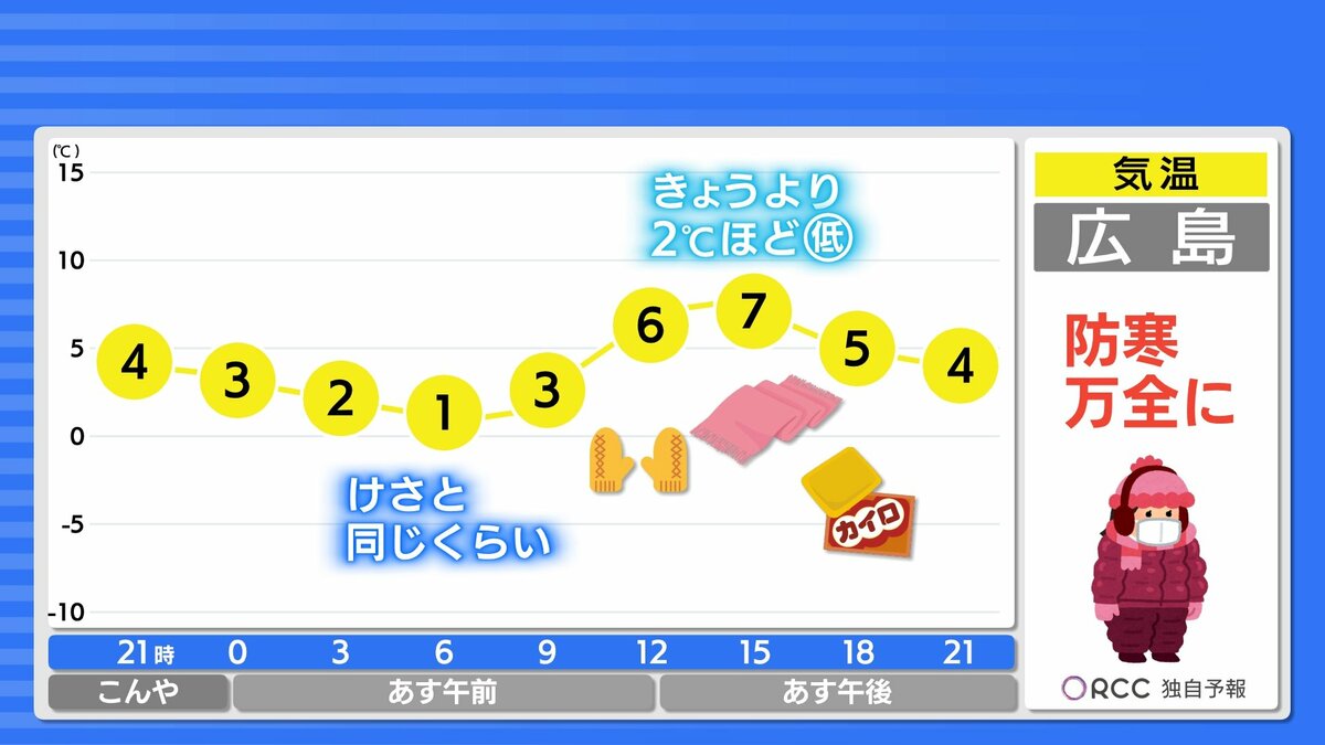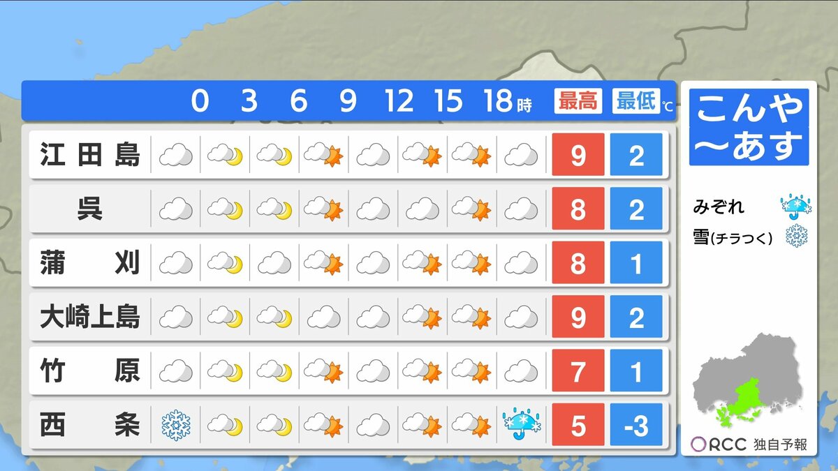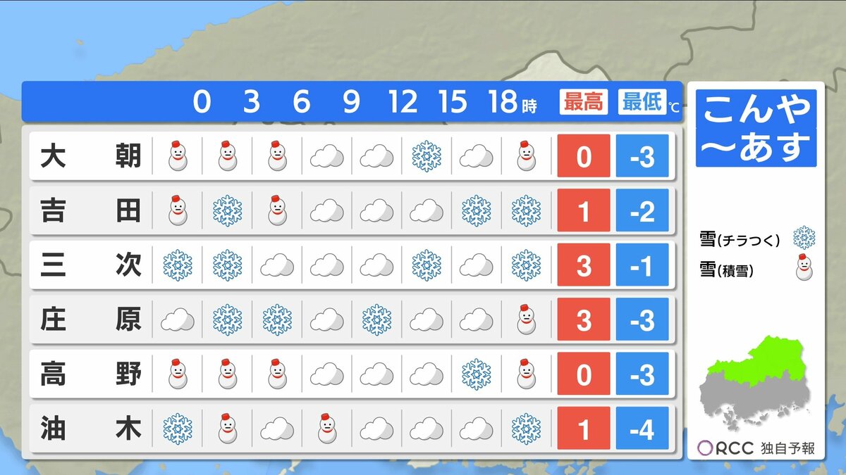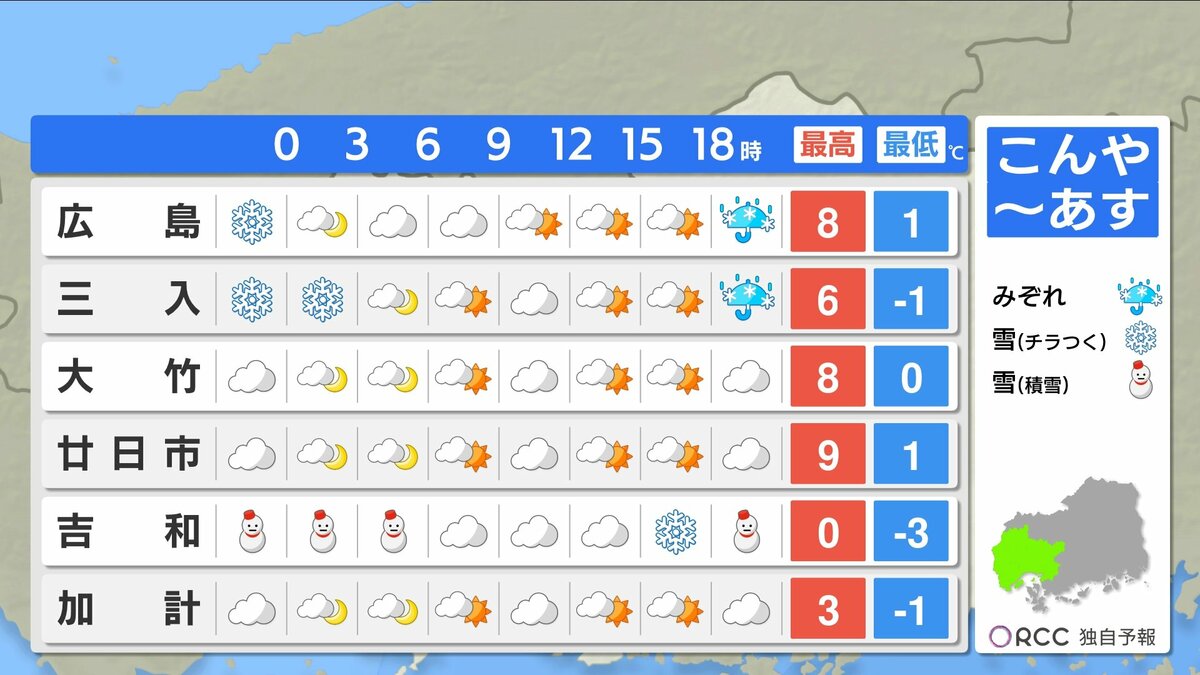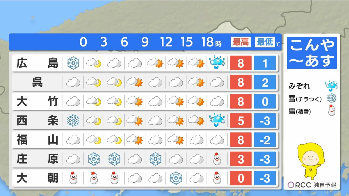 きょう29日(木)の広島県内は、沿岸部では晴れましたが、北部を中心に雪が降り、南部でも雪が降った所がありました。最高気温は、広島市中区で8.1℃ 福山8.4℃など、各地で平年を下回る真冬の寒さになりました。