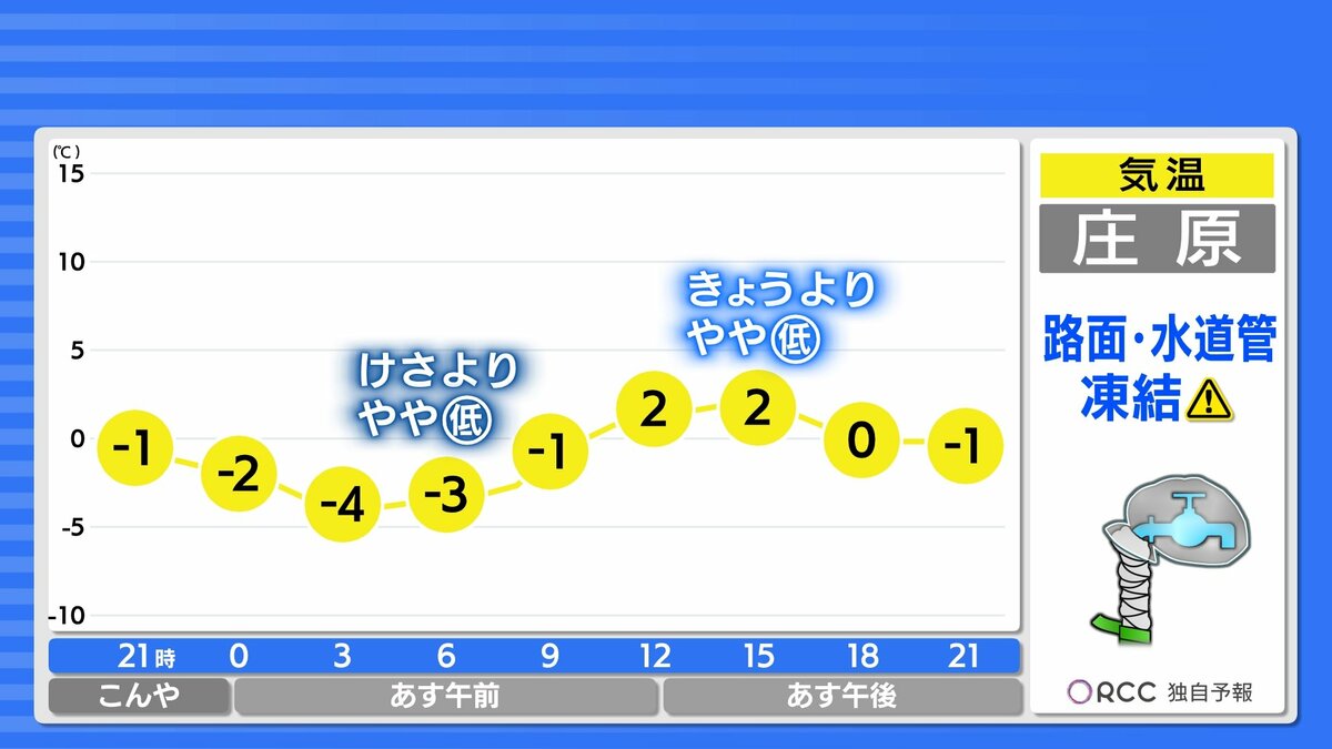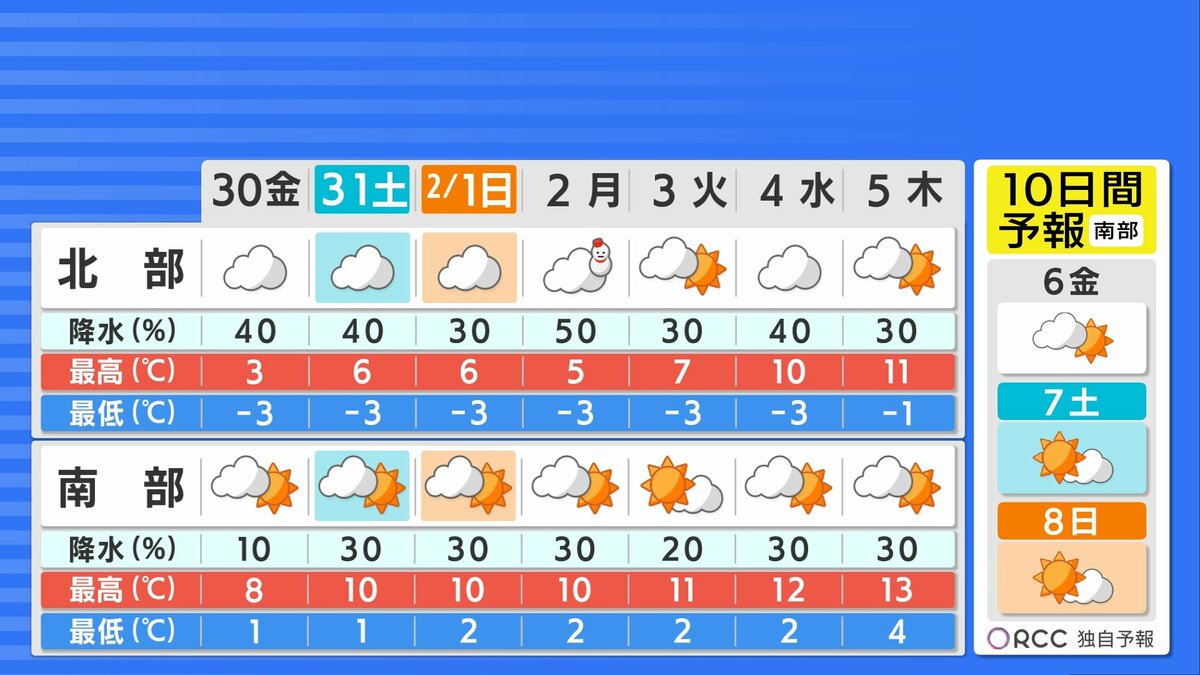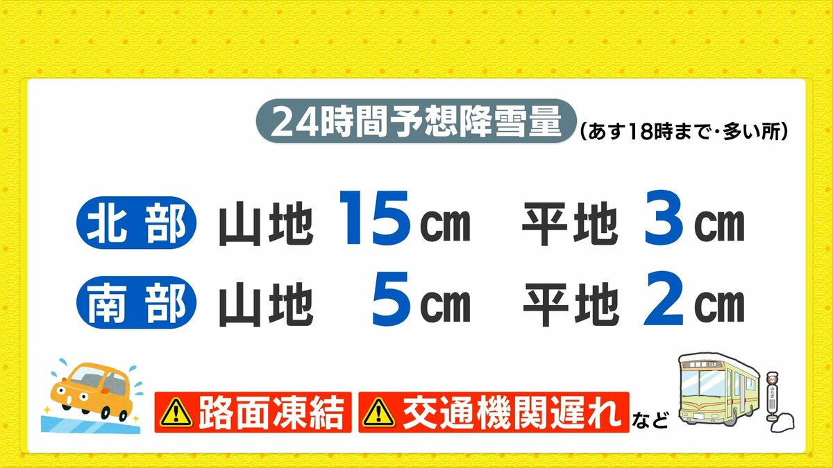 南部では日差しが届く時間もありますが、日中の気温は1ケタで真冬の厳しい寒さが続くでしょう。防寒対策は万全にしてお過ごしください。朝晩の冷え込みによって、現在積雪している所では、路面が凍結しやすくなります。