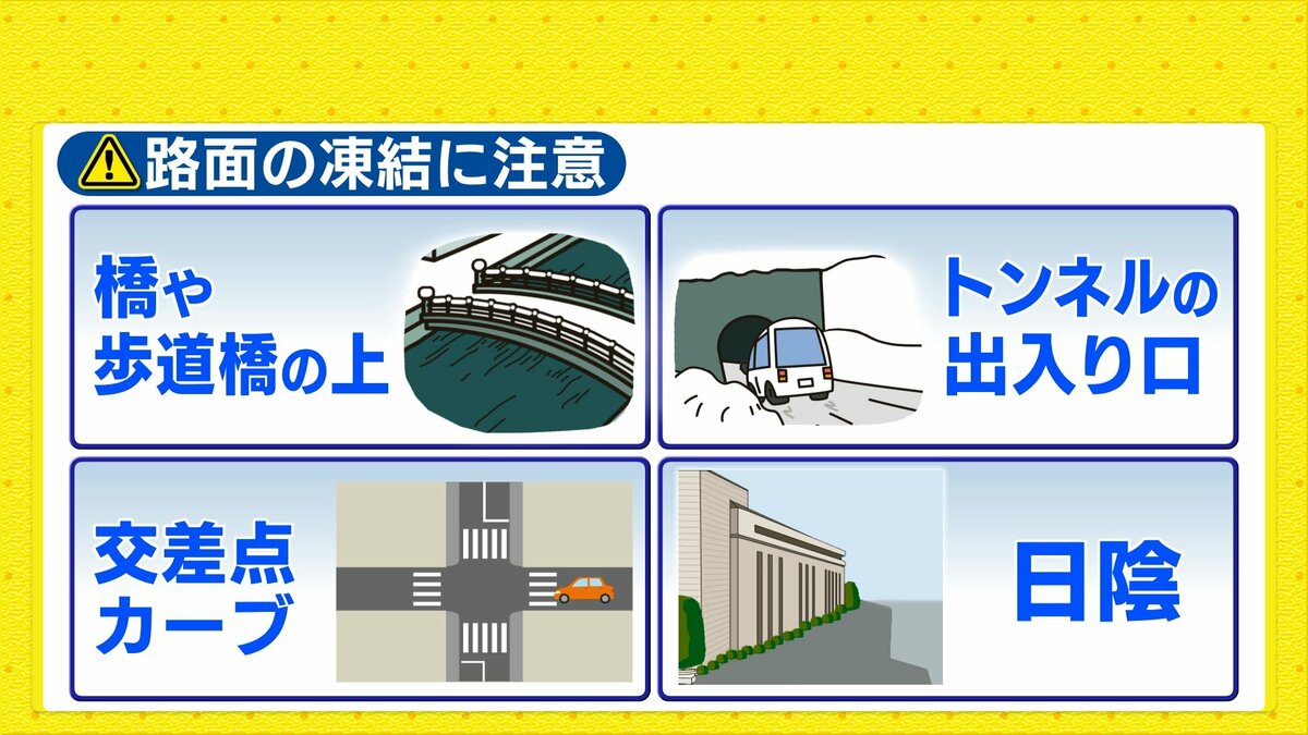 橋の上や歩道橋の上、トンネルの出入り口などは風が通りやすく路面の温度が下がりやすくなるため特に注意が必要です。