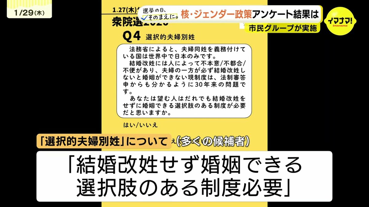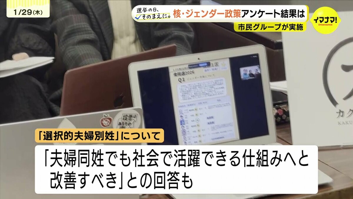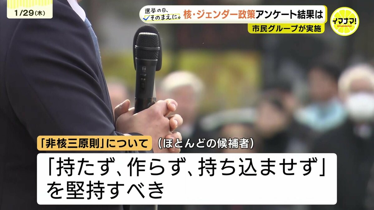 このうち非核三原則については、ほとんどの候補者が「『持たず、作らず、持ち込ませず』を堅持すべき」と回答しました。また、選択的夫婦別姓については、多くの候補者が「だれでも結婚改姓をせずに婚姻できる選択肢のある制度が必要」と回答した一方で、「夫婦同姓でも社会で活躍できる仕組みへと改善すべき」との回答もありました。なお、このアンケートについて自民党と参政党の候補者からの回答は、ありませんでした。