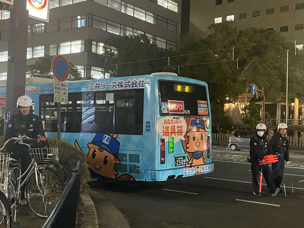 広島市中区の交差点で29日、路線バスとバイクが衝突する事故があり、バイクの運転手と乗客の2人がけがをしました。
