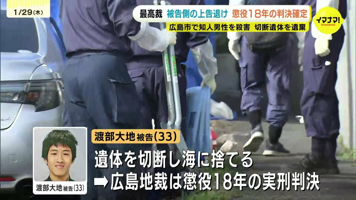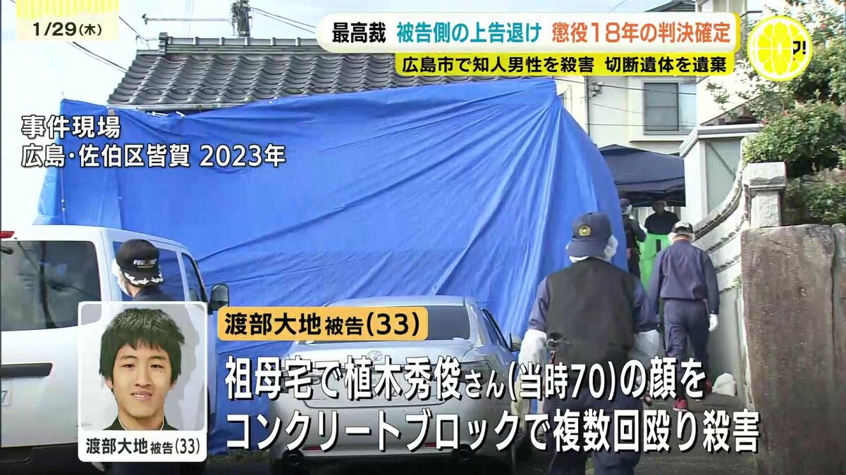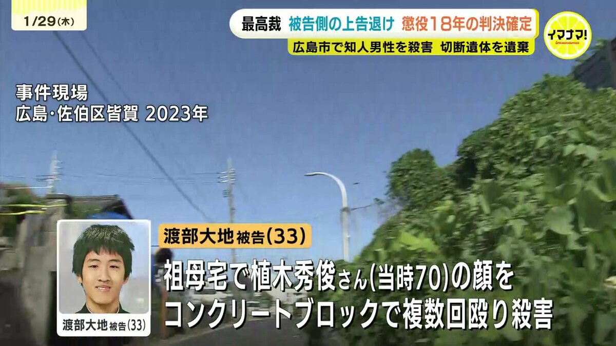広島市佐伯区皆賀の渡部大地被告は、祖母の家で、祖母の交際相手だった植木秀俊さんの顔をコンクリートブロックで複数回殴って殺害。その遺体を切断したほか、海に捨てるなどしたとして、一審の広島地裁は渡部被告に対し懲役18年の実刑判決を言い渡していました。
