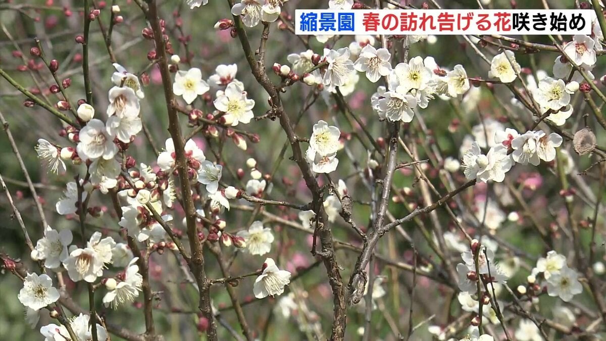 30日は上空に強い寒気が入り、真冬の寒さとなっていますが、広島市の縮景園では春の訪れを告げる花が咲き始めました。