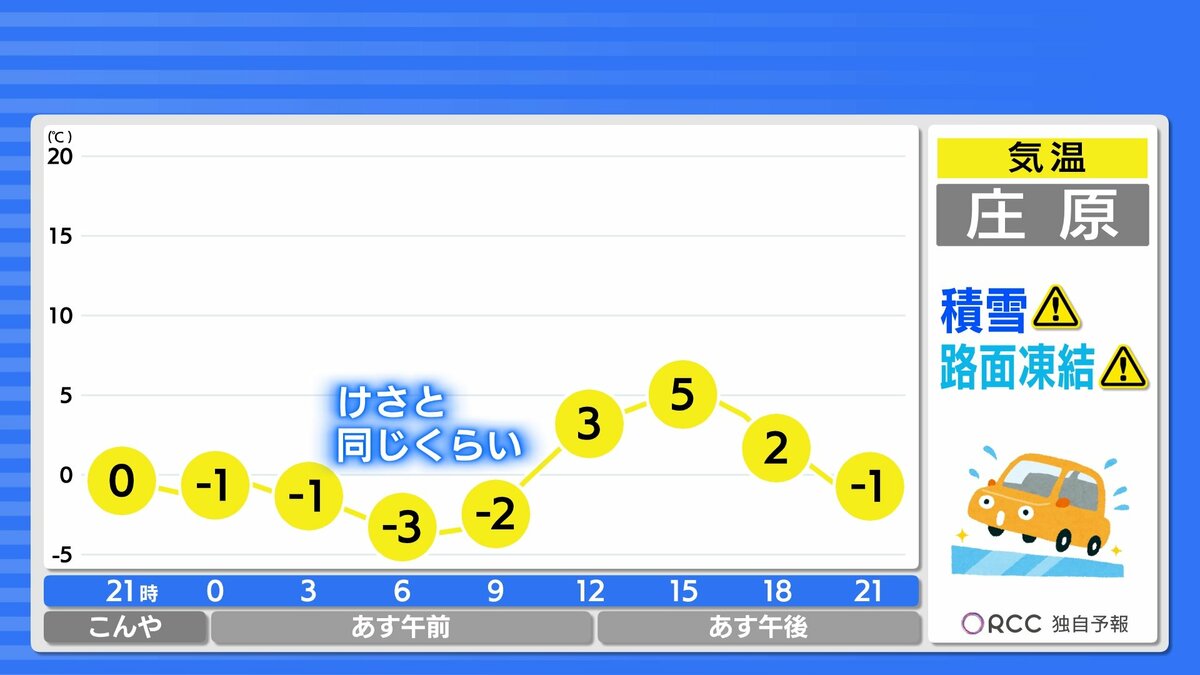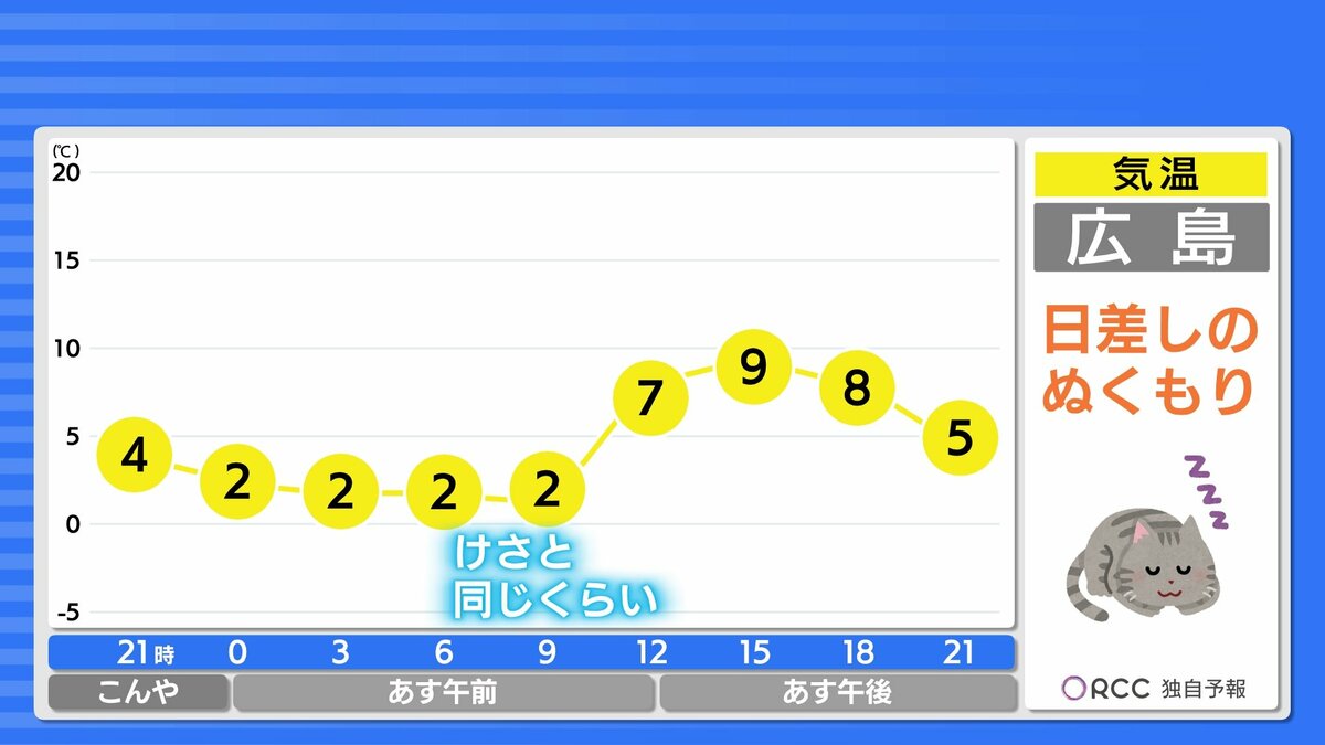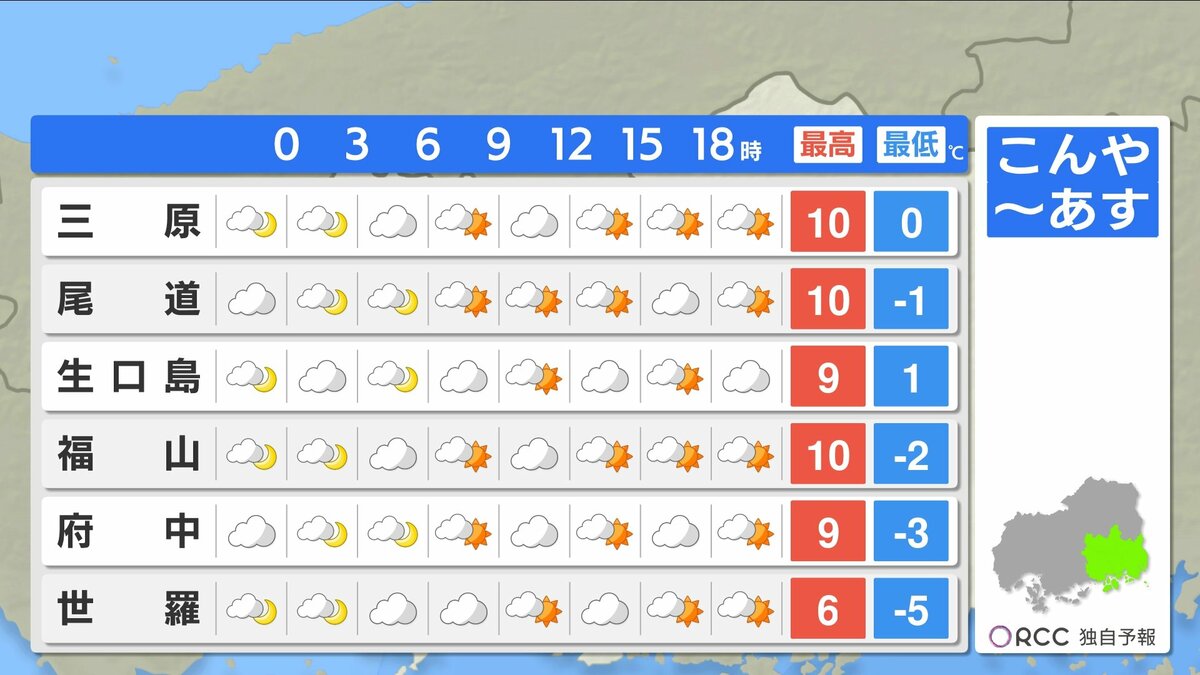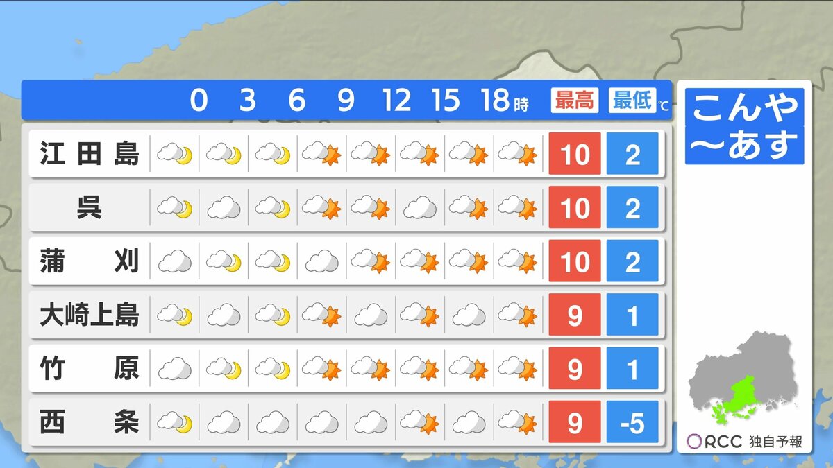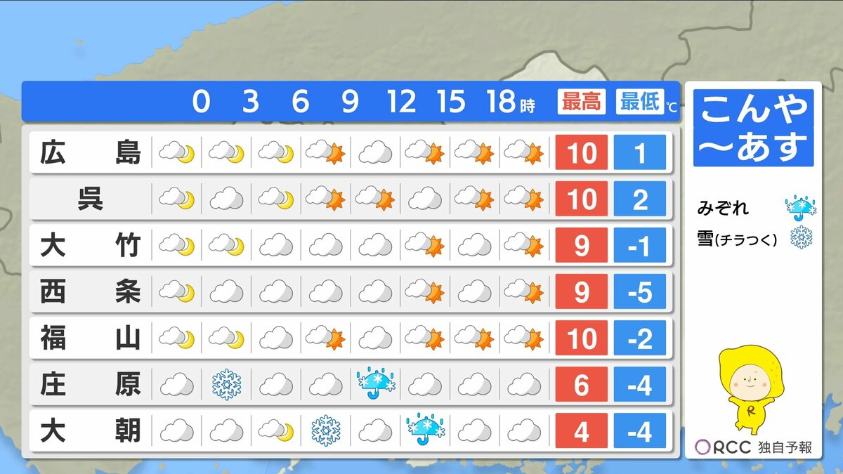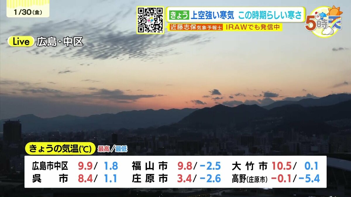 きょう30日(金)の広島県内は、上空の寒気が強く、この時期らしい寒さとなりました。最高気温は、大竹市で10.5℃、広島市中区で9.9℃、庄原市高野町で-0.1℃でした。