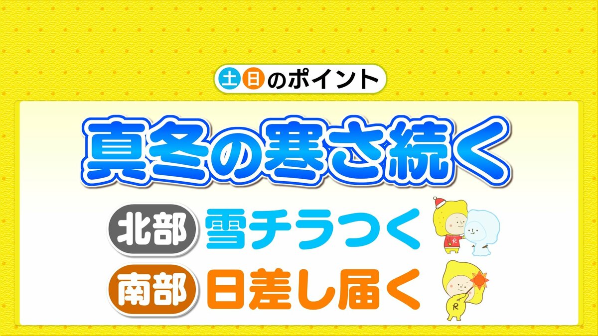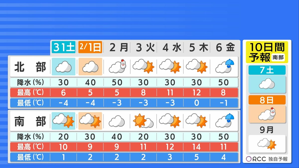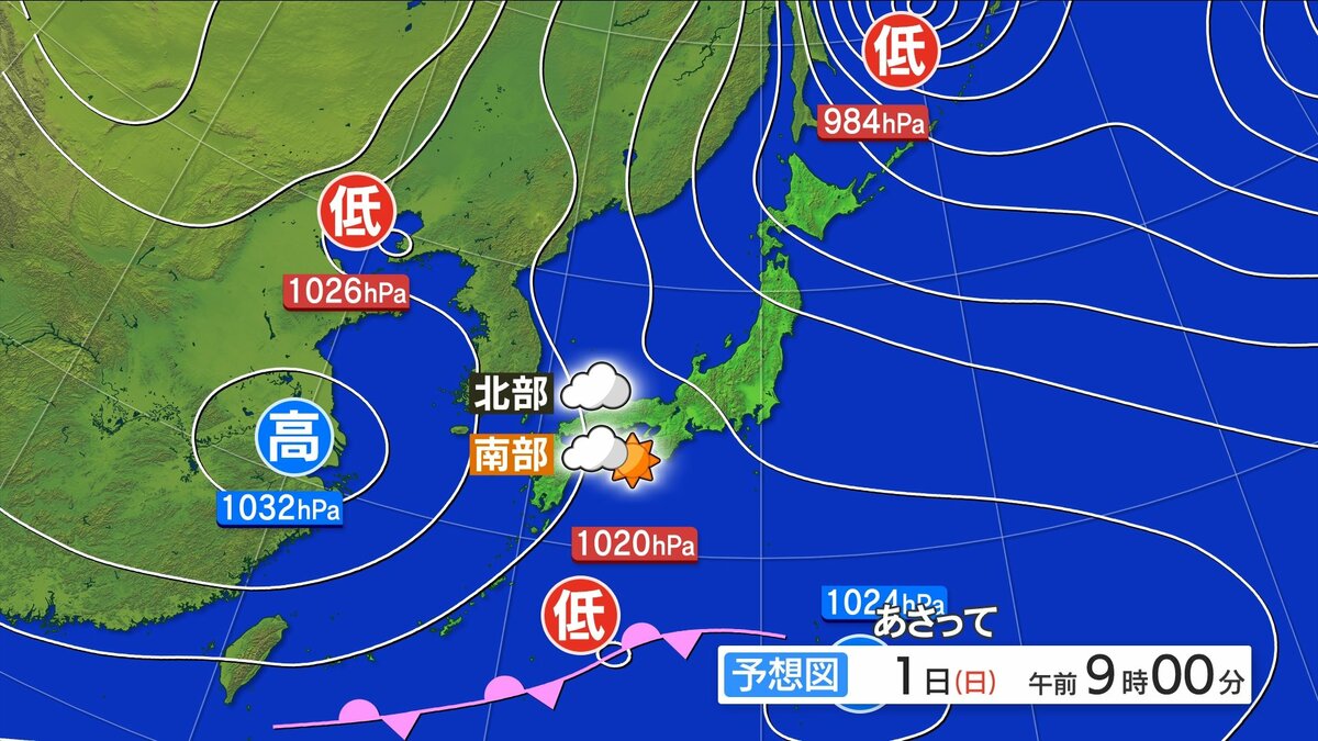 あさって2月1日(日)は、寒気の影響で雲が多く、南部では日差しが届きますが、北部では雪やみぞれが降る時間があるでしょう。空気が乾燥した状態が続いています。火の取り扱いには十分ご注意ください。