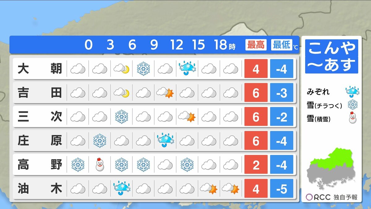 あす31日(土)は、引き続き上空の寒気の影響を受けて、北部では雪が降る見込みです。寒気がややゆるむため、雪からみぞれに変わる時間があるでしょう。南部では、雲が多いものの日差しが届く予想です。最高気温は、広島・福山10℃、呉9℃、庄原6℃、この時期らしい寒さでしょう。