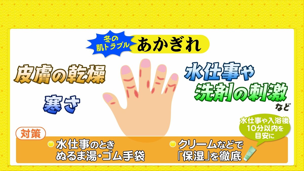 皮膚の乾燥によって起こりやすいのが「あかぎれ」です。特に、水仕事を多くされる方は、洗剤の刺激でもあかぎれが起こりやすくなります。水仕事の際は、水ではなくぬるま湯を使用するのがおすすめです。また、皮膚の皮脂を逃さないために、ゴム手袋を使用するのも有効です。