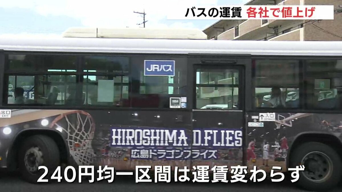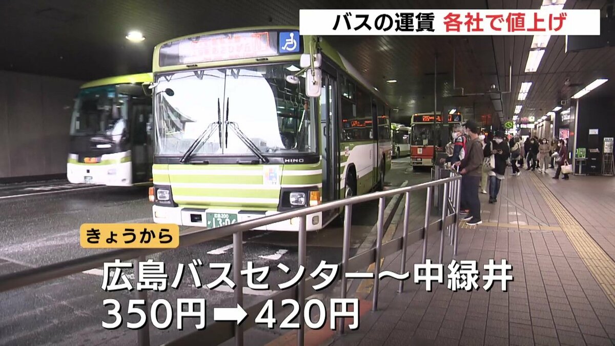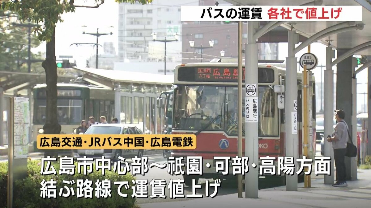 広島交通とJRバス中国、広島電鉄は1日から、広島市中心部と、安佐南区の祇園や、安佐北区の可部、高陽方面を結ぶ路線で、運賃を値上げしました。初乗り運賃はこれまでの170円から200円になります。