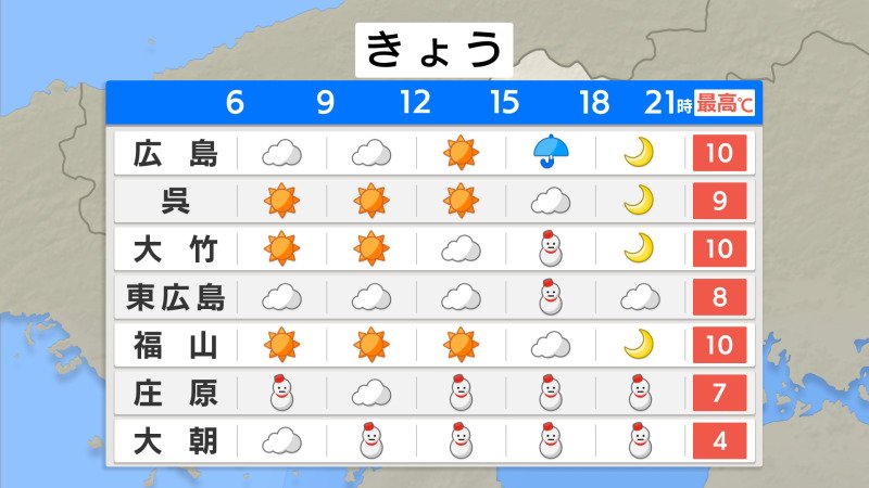 最低気温は、広島市中区で2.5℃・福山市-0.8℃・庄原市-2.4℃・神石高原町-4.5℃を観測するなど厳しい冷え込みが続いています。