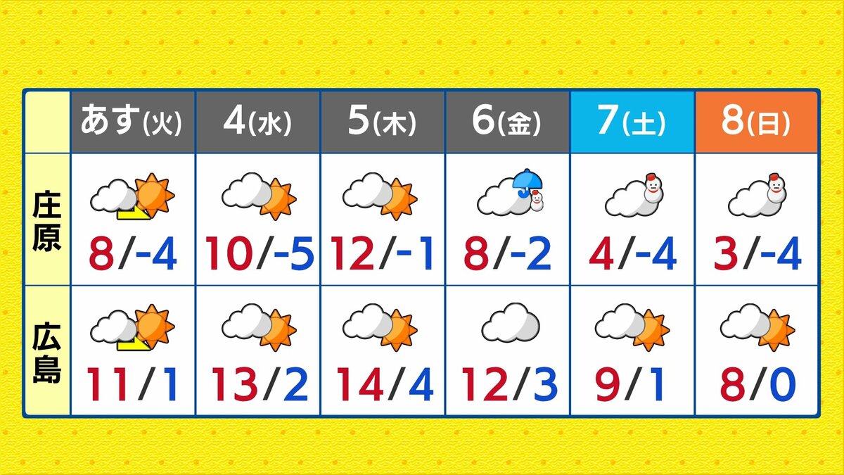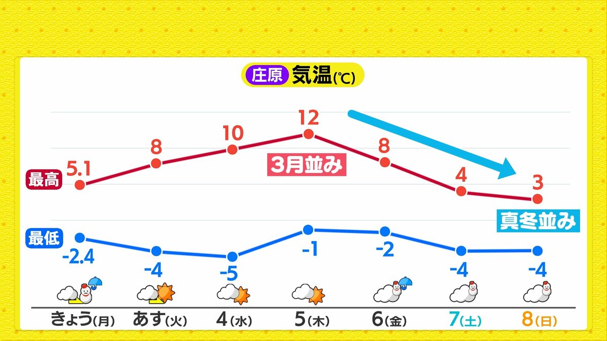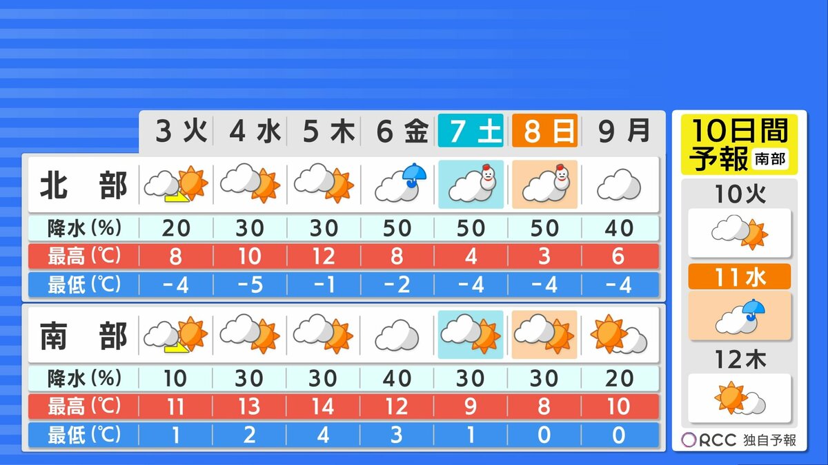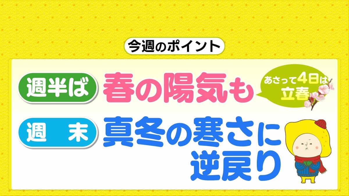 ただ、週末には再び強い寒気が南下し、北部を中心に雪が降る見込みです。気温は急降下し、真冬の寒さに逆戻りするでしょう。気温のアップダウンがかなり大きいですので、体調管理にはご注意ください。