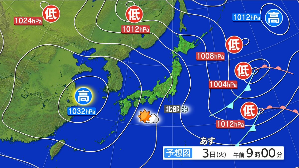 大陸の高気圧の影響でおおむね晴れるでしょう。北部を中心に明け方頃まで雪の降るところがある見込みです。山地を中心に雷を伴う所があるかもしれません。空気の乾燥した状態が続いています。火の取り扱いにはくれぐれもご注意ください。