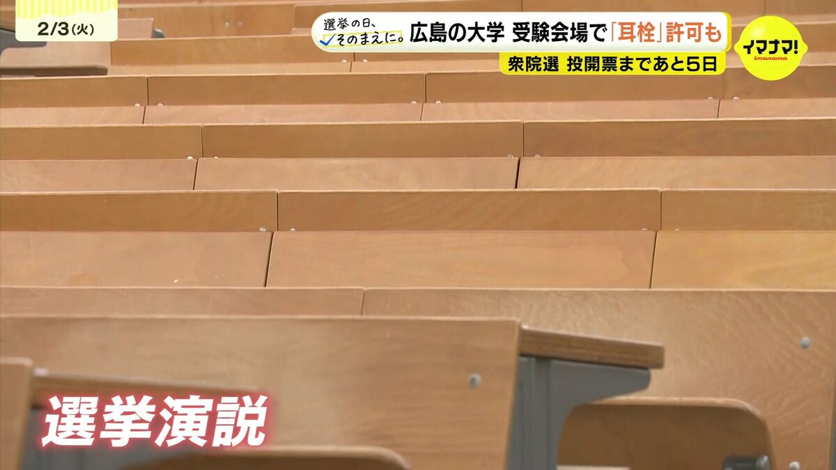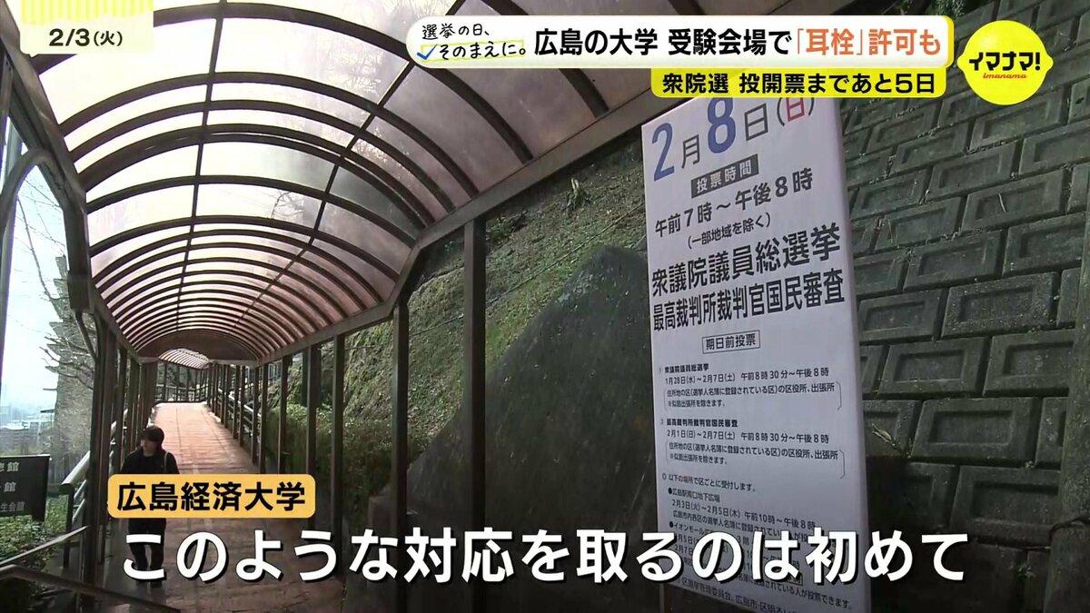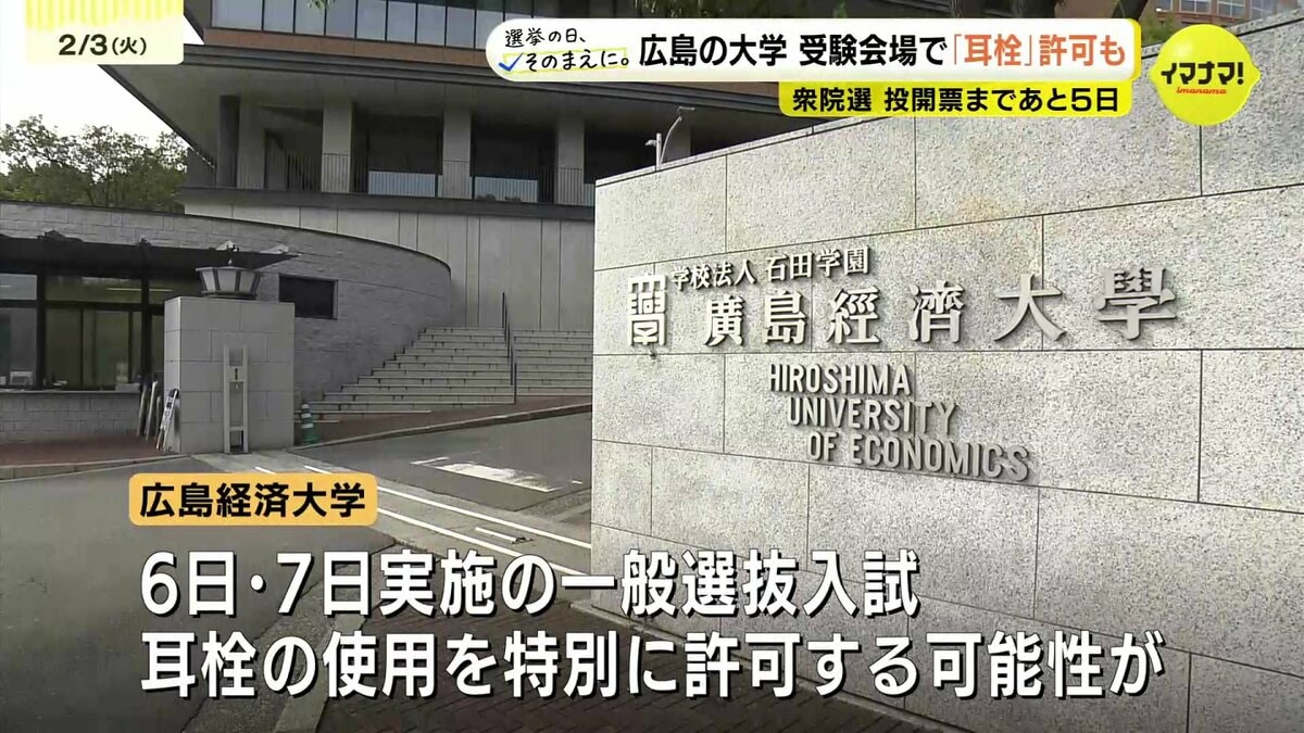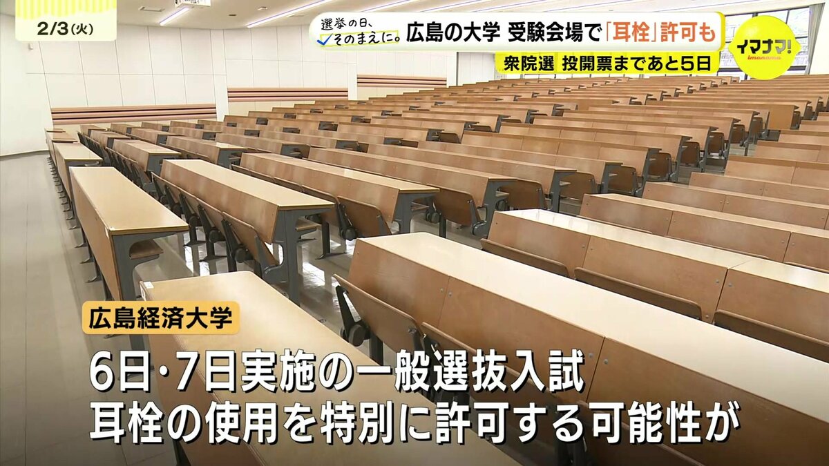 広島経済大学です。今週6日と7日に行なわれる一般選抜入試について、特別に耳栓の使用を許可する可能性があるということです。選挙演説の音が大きく聞こえる場合、認める可能性があるということです。