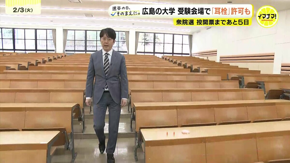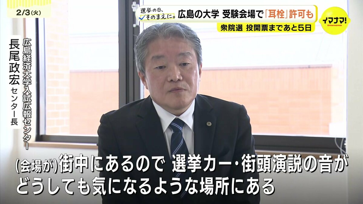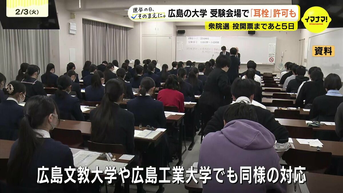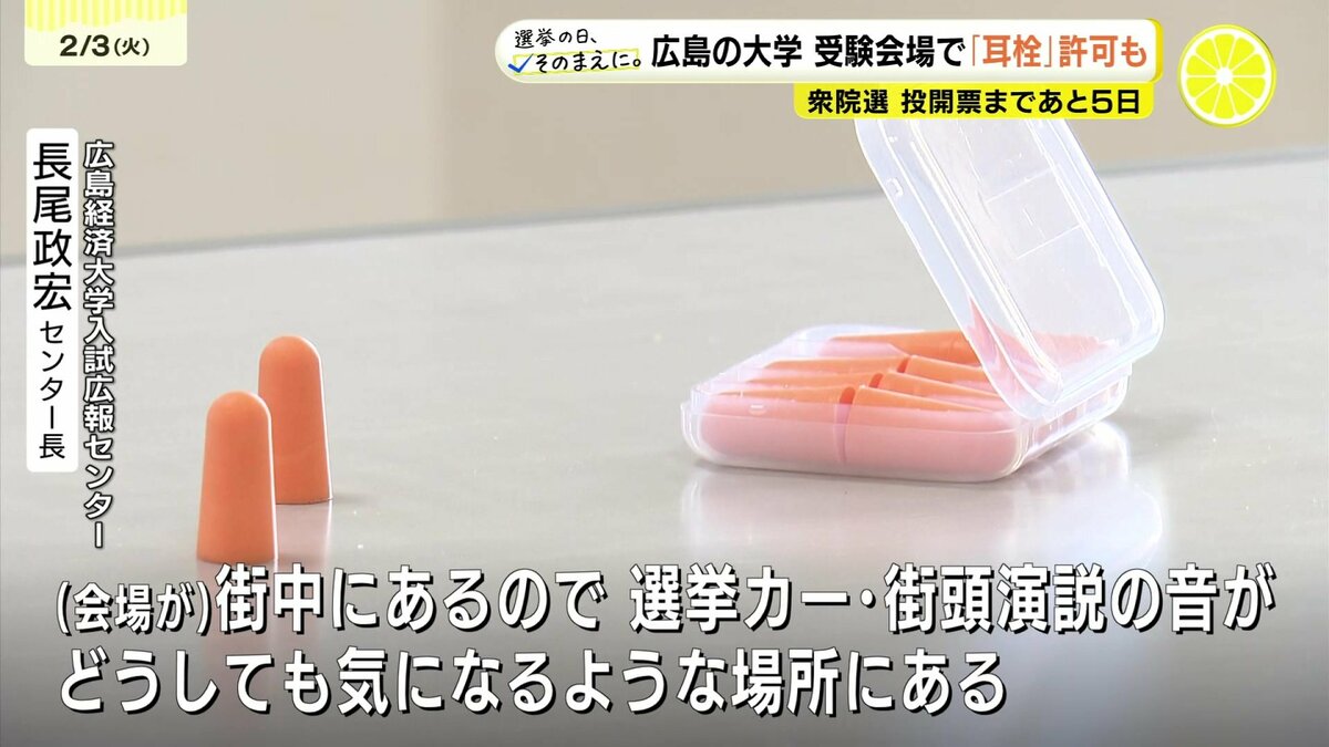 広島経済大学です。今週6日と7日に行なわれる一般選抜入試について、特別に耳栓の使用を許可する可能性があるということです。選挙演説の音が大きく聞こえる場合、認める可能性があるということです。