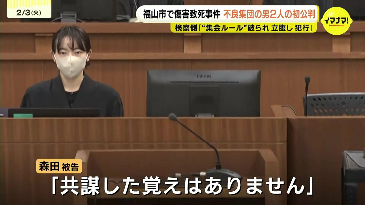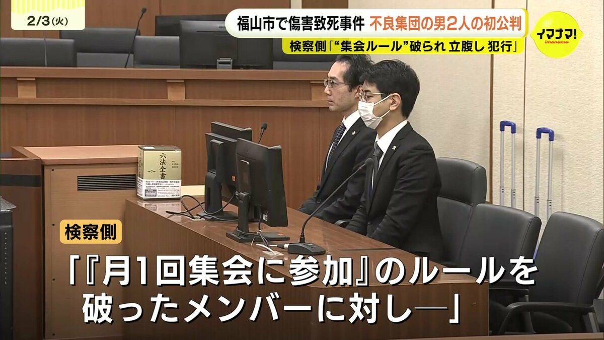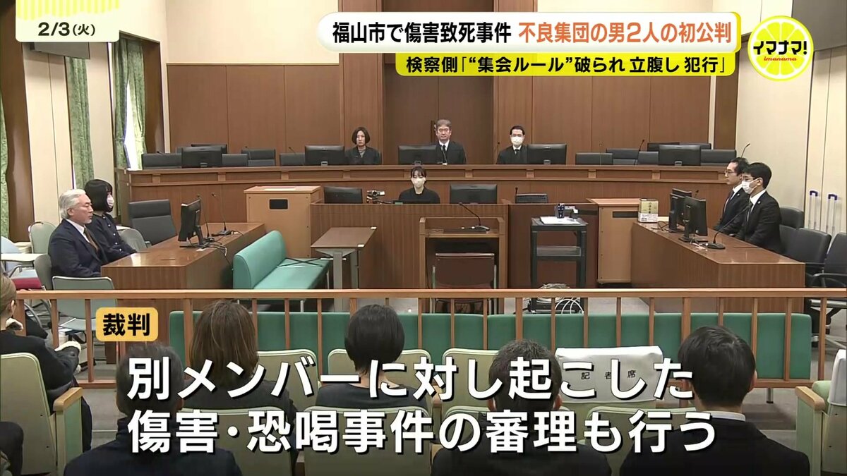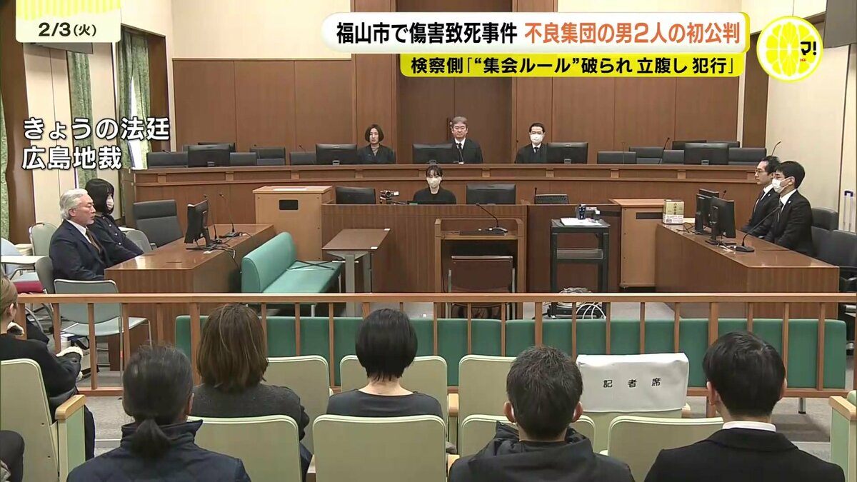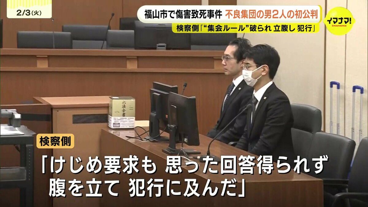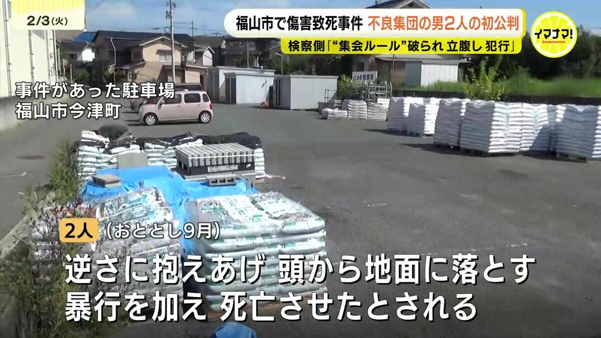起訴状によりますと、おととし9月、2人は共謀して福山市内の駐車場や木材置き場で男性(当時18)に対し、拳や自転車のサドルで複数回殴ったり、両手で逆さに抱えあげて頭から地面に落としたりする暴行を加えて死亡させたとされています。