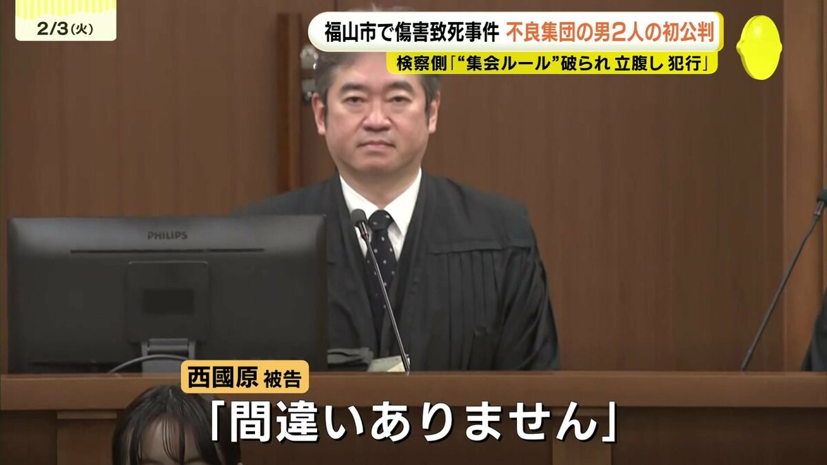 おととし9月、広島県福山市内で男性に暴行を加えて死亡させるなどした傷害致死などの罪で起訴された 不良集団「阿修羅」のリーダー西國原拓夢 被告(25)と幹部の森田悠太被告(25)の裁判員裁判が3日、広島地裁で始まりました。