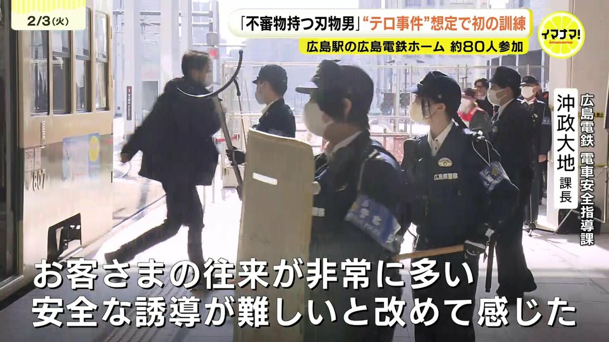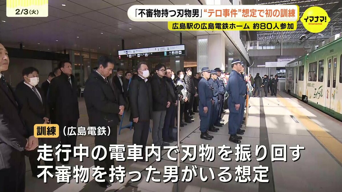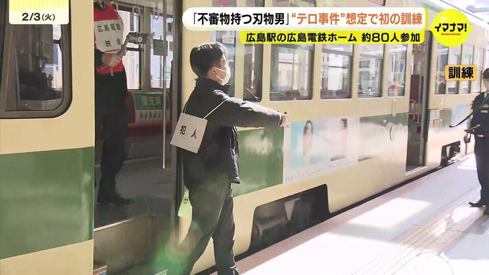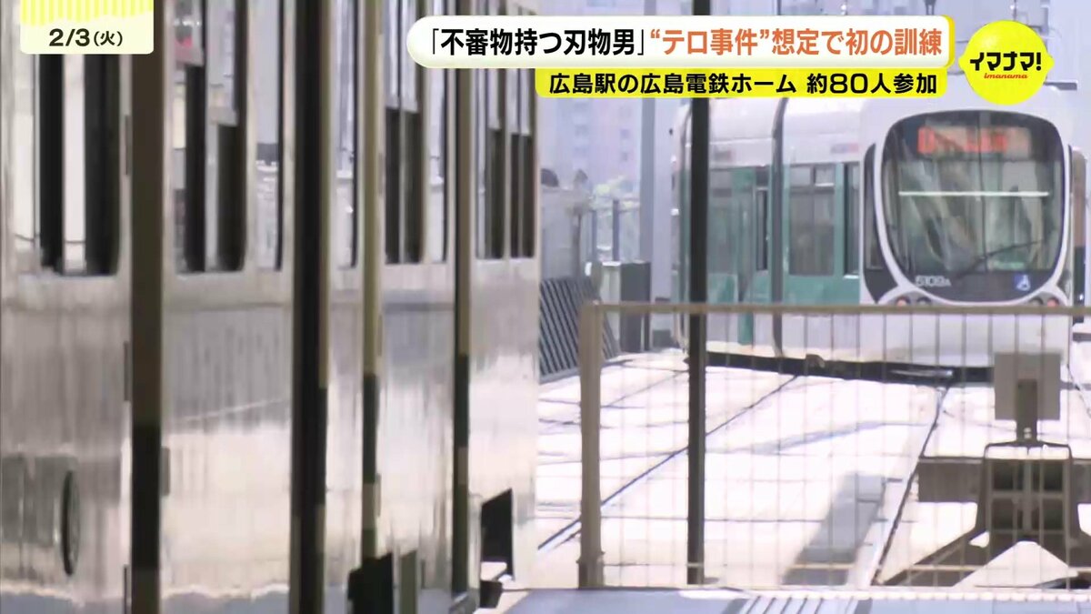 訓練は広島電鉄の走行中の電車に、「刃物を振り回す、不審物を持った男がいる」という想定で、実際の電車を使用して行われました。参加したのは、広島電鉄や県警からあわせておよそ80人です。