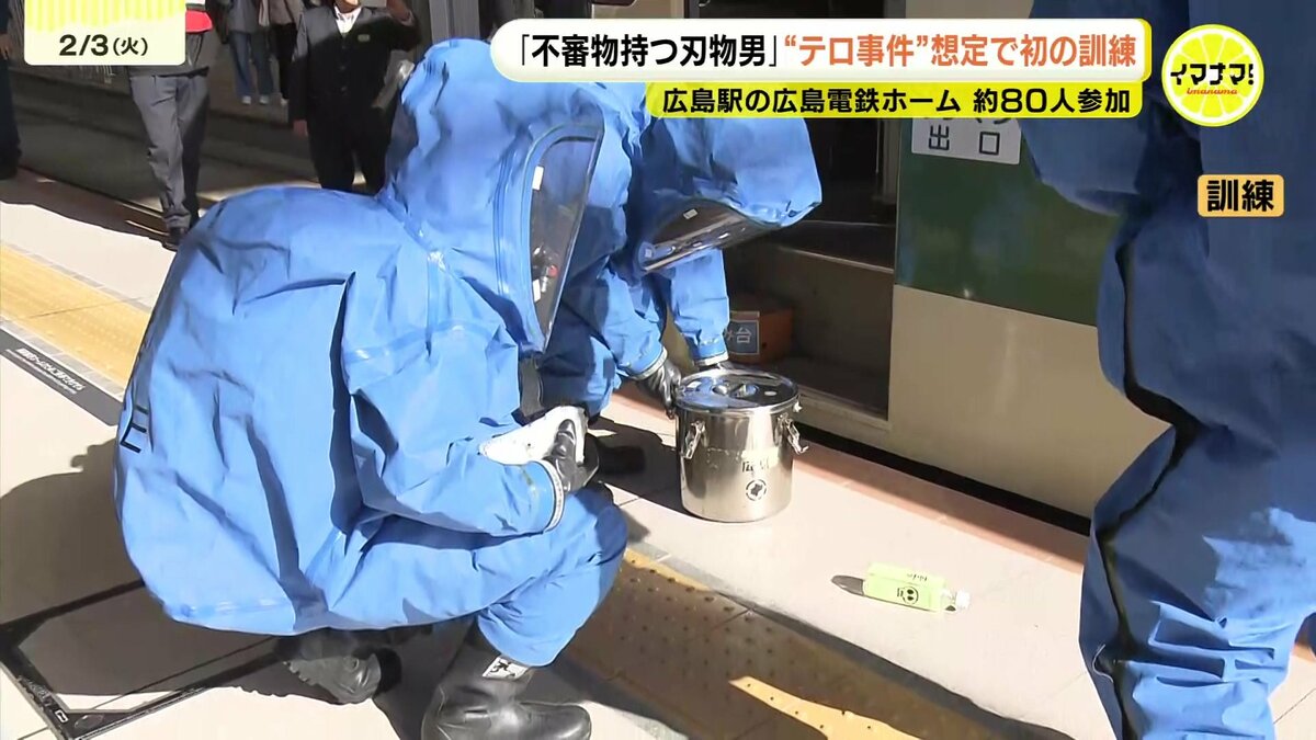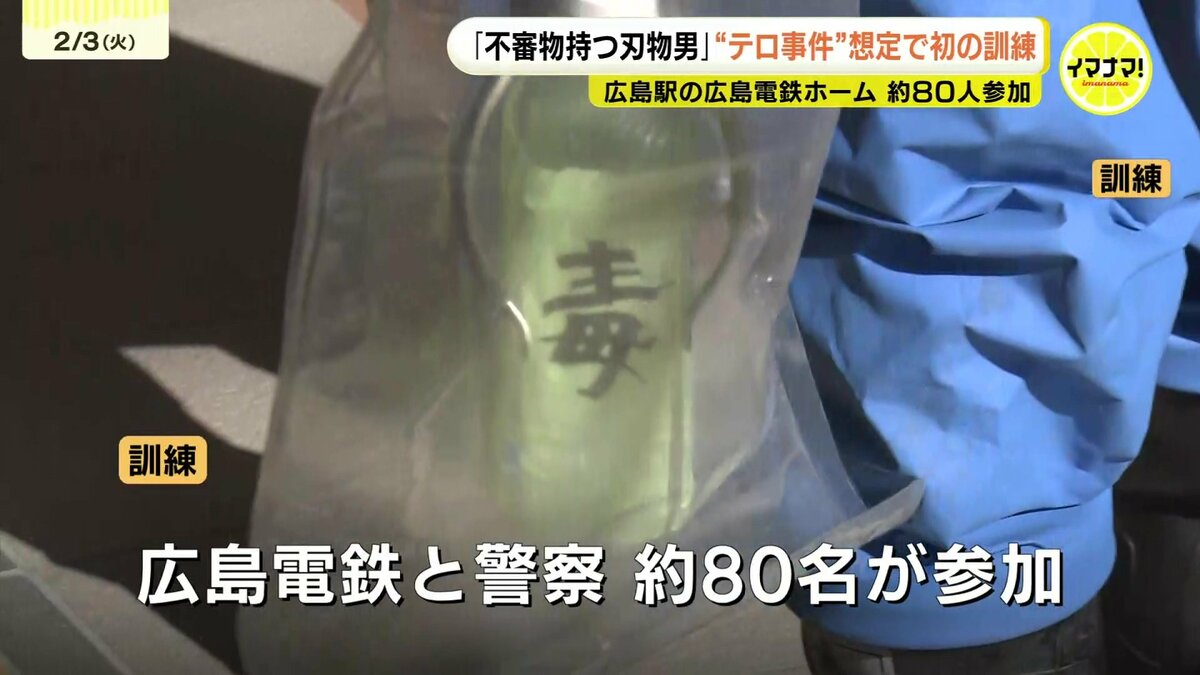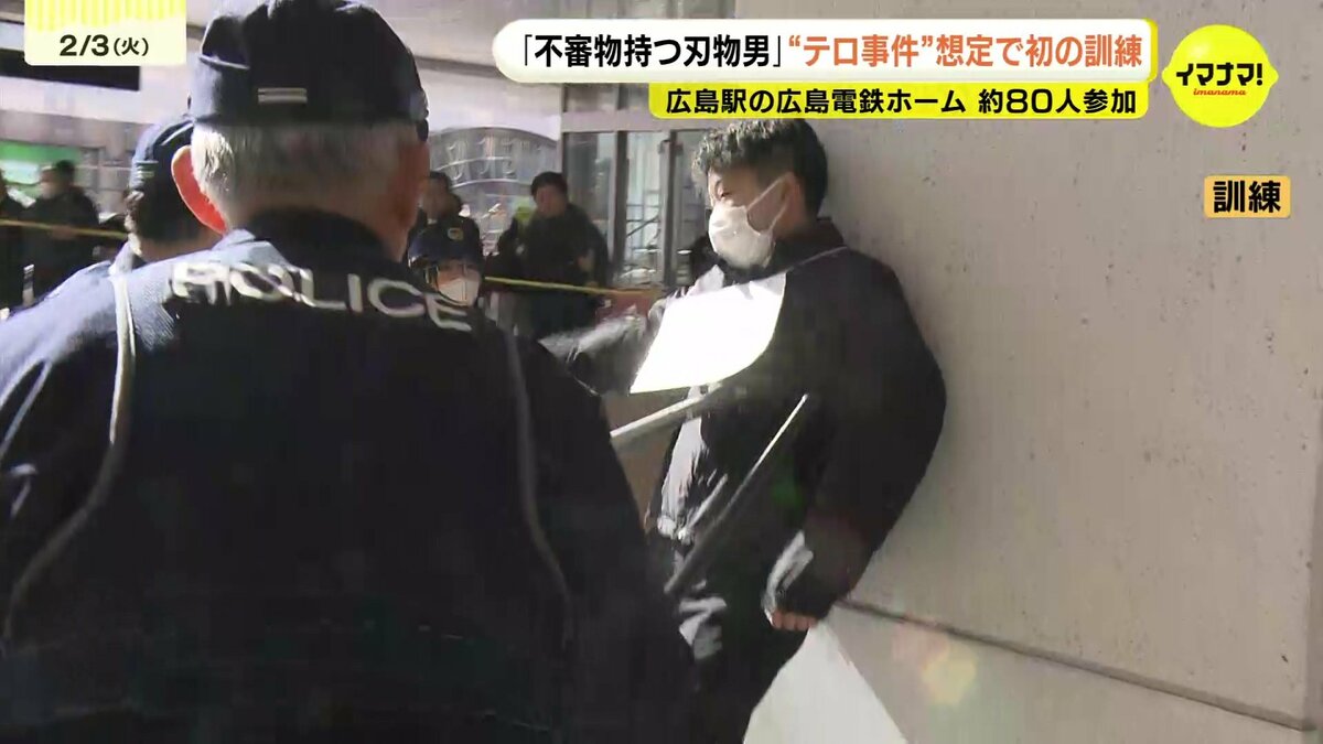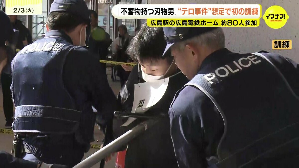 訓練は広島電鉄の走行中の電車に、「刃物を振り回す、不審物を持った男がいる」という想定で、実際の電車を使用して行われました。参加したのは、広島電鉄や県警からあわせておよそ80人です。
