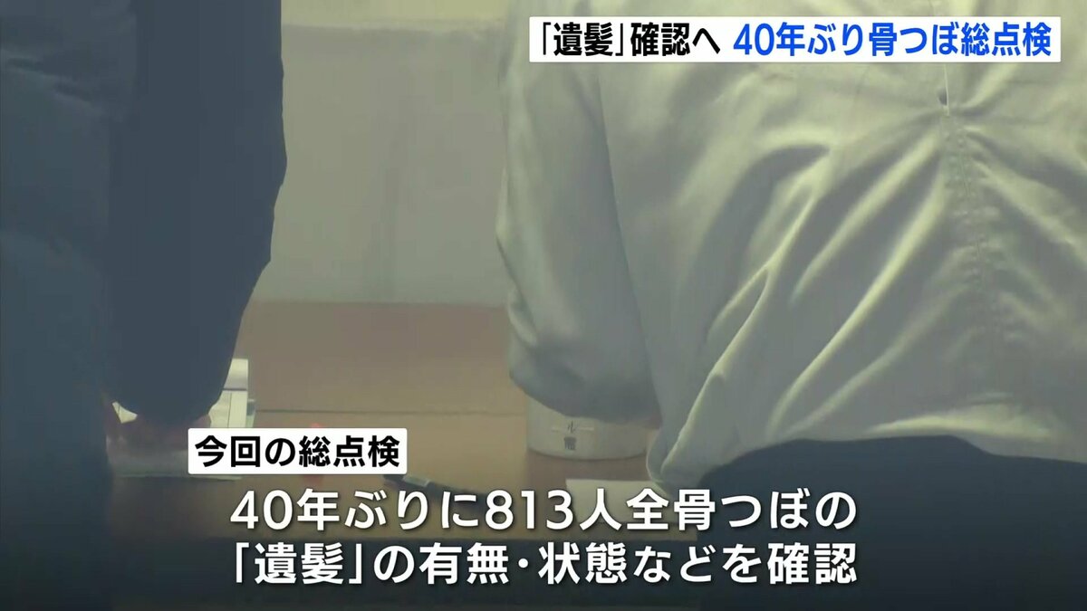 今後も遺族の要望があれば、DNA型鑑定を行う方針で、今回、40年ぶりに813人全ての骨つぼを開けて、「遺髪」の有無などを総点検することにしました。遺髪があるのは10人程度とみていて、写真も撮影するということです。