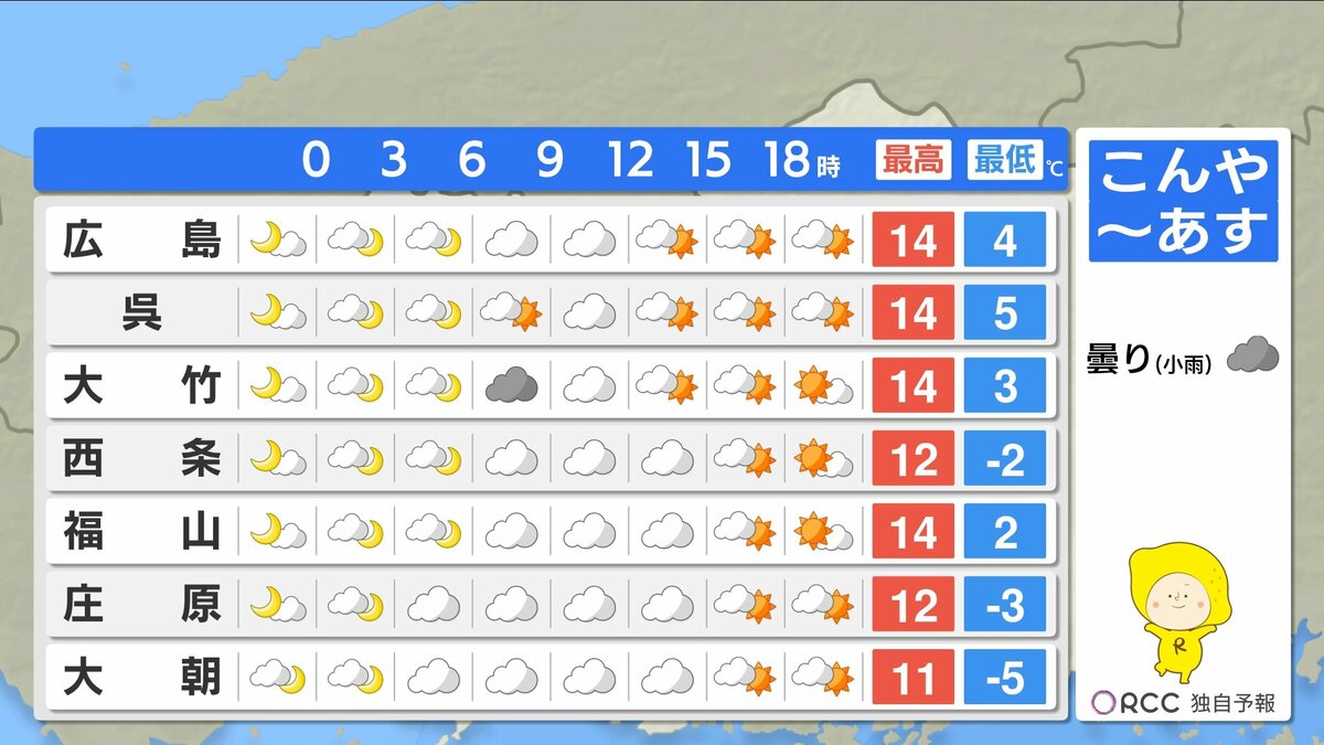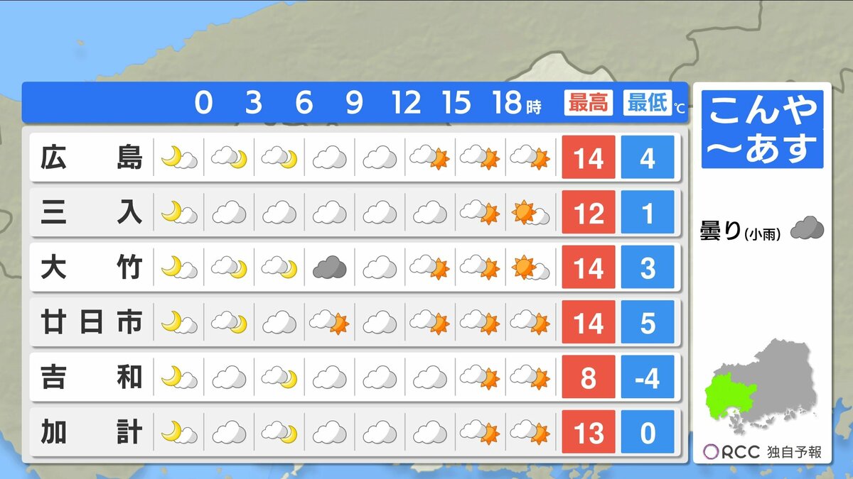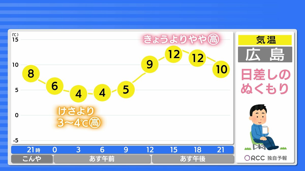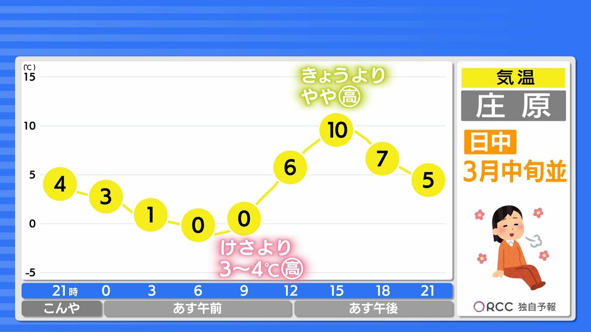 日中の気温はきょうよりもさらに高くなり、3月中旬~下旬並の春の陽気になるでしょう。午後は南風が吹くため、日差しが届くとより暖かく感じられそうです。服装で上手く調節をしてください。