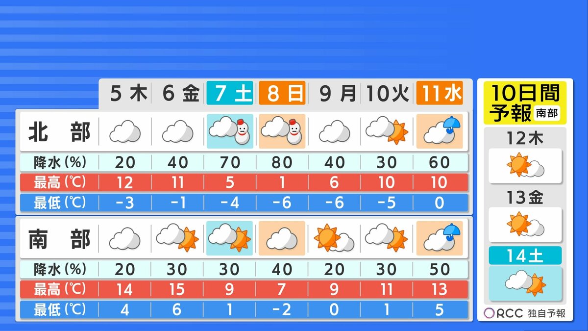 金曜日以降徐々に上空の寒気が南下し、週末には寒気の流れ込みが強まります。北部を中心に積雪が増え、まとまった雪になる可能性があります。南部でも雪が降る所があるでしょう。