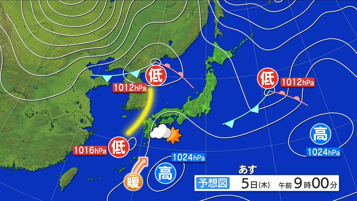 あすも本州の南に位置する高気圧の影響で日差しが届きますが、気圧の谷の影響で雲が広がりやすくなるでしょう。一部にわか雨の地点があるかもしれません。南からはきょうよりも暖かい空気が入りやすく、気温が上昇する見込みです。