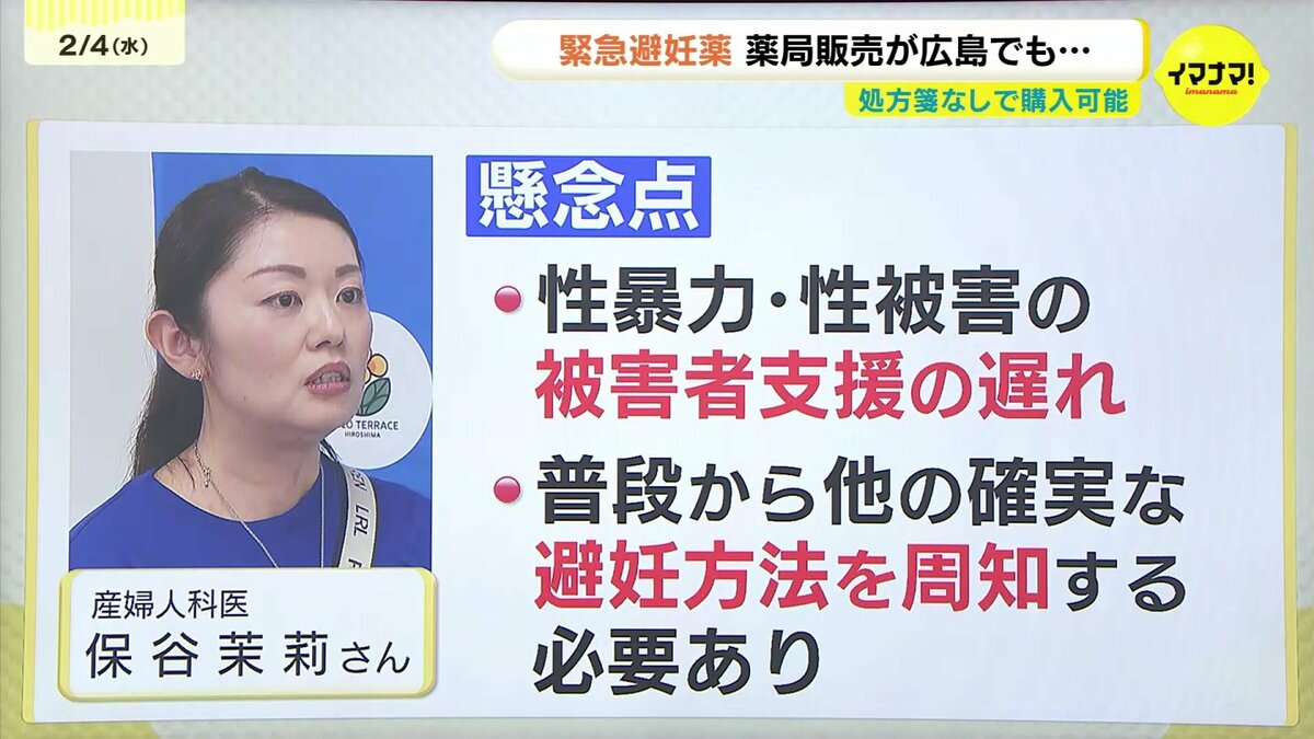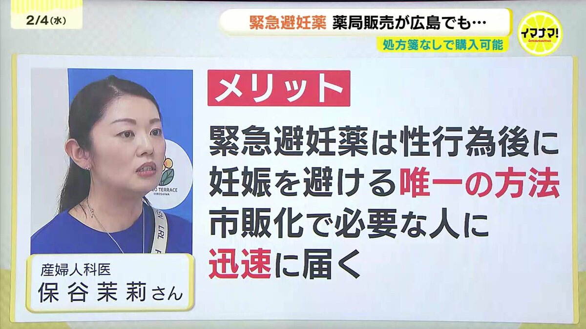 若者のための「ひろしまユースクリニック」を運営する産婦人科医の保谷茉莉医師は、今回の市販化について、「緊急避妊薬は性行為後に妊娠を避ける唯一の方法。市販化によって必要な人に迅速に届くのは大きなメリット」としています。