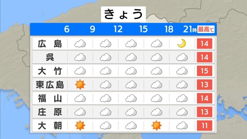 この後も、暖かい空気の影響を受けて、日中は3月並みの気温となるでしょう。中国地方は、気圧の谷になっているため、雲が広がりやすいですが、日差しが届く時間もある見込みです。パラッとにわか雨が降るところもありますが、大きな崩れはない見通しです。予想最高気温は、広島・呉・福山で14℃、庄原13℃となっています。