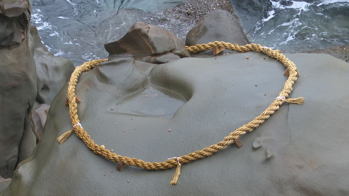 本殿の下にある霊石亀石 枡形のくぼみに運玉を投げ入れると願いが叶うと言われている