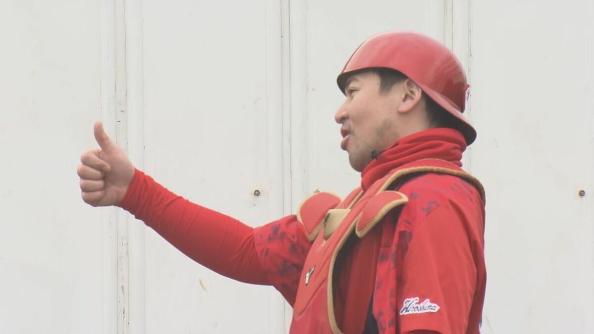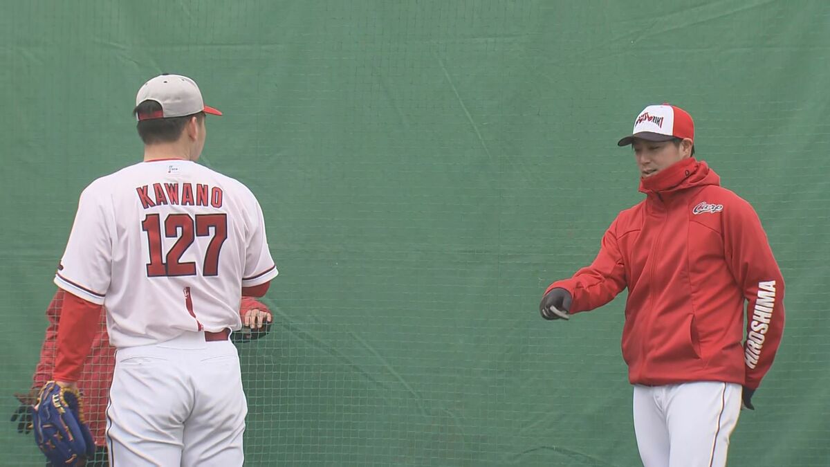 ブルペンのピッチングの合間には會澤翼が清水叶人にキャッチングのアドバイスをする様子がありました。
