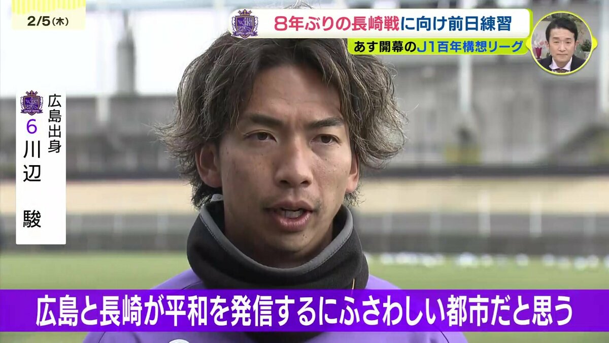 また、広島と長崎の対戦は、8年ぶりとなる「ピースマッチ」としても開催されます。広島出身の川辺駿選手は、「前回の対戦が8年前ぐらいで、僕自身も出てたので、ピースマッチに選手として試合に出られて嬉しい。日本の中で広島と長崎が、平和を発信するにふさわしい都市だと思う。意味のある、意義のある試合にできれば」と、この一戦に込める特別な思いを語りました。