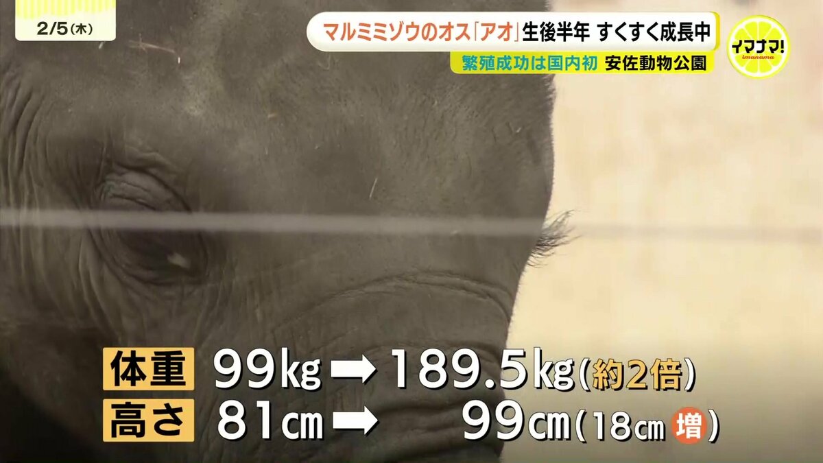 生後間もなく計測したときの体重は99キロでしたが、現在はなんと189.5キロとおよそ2倍に。地面から肩までの高さも先月測ったときには18センチも伸びて、99センチにまで成長していました。