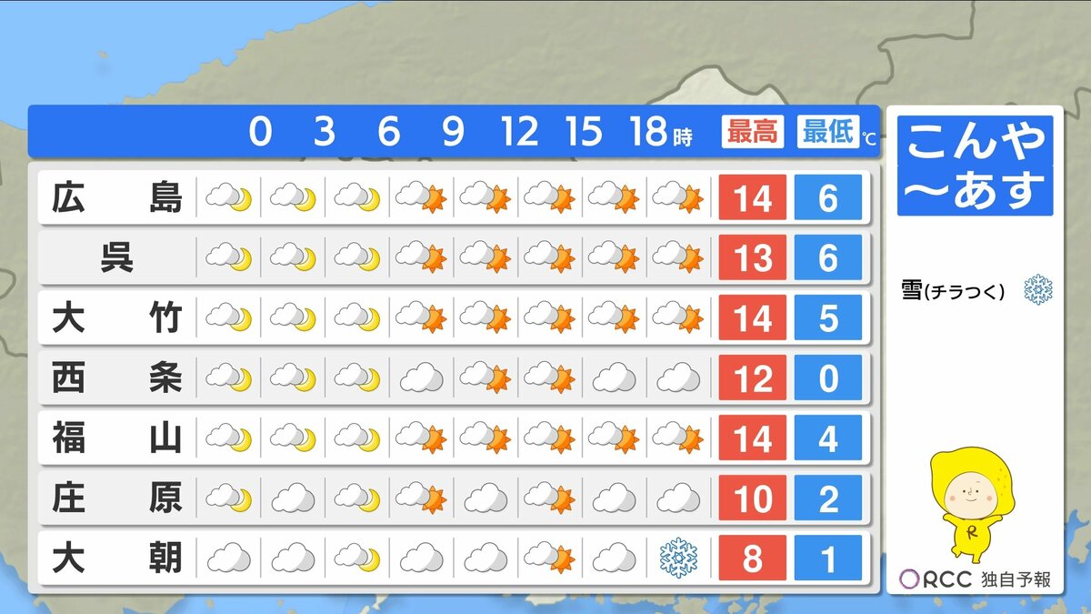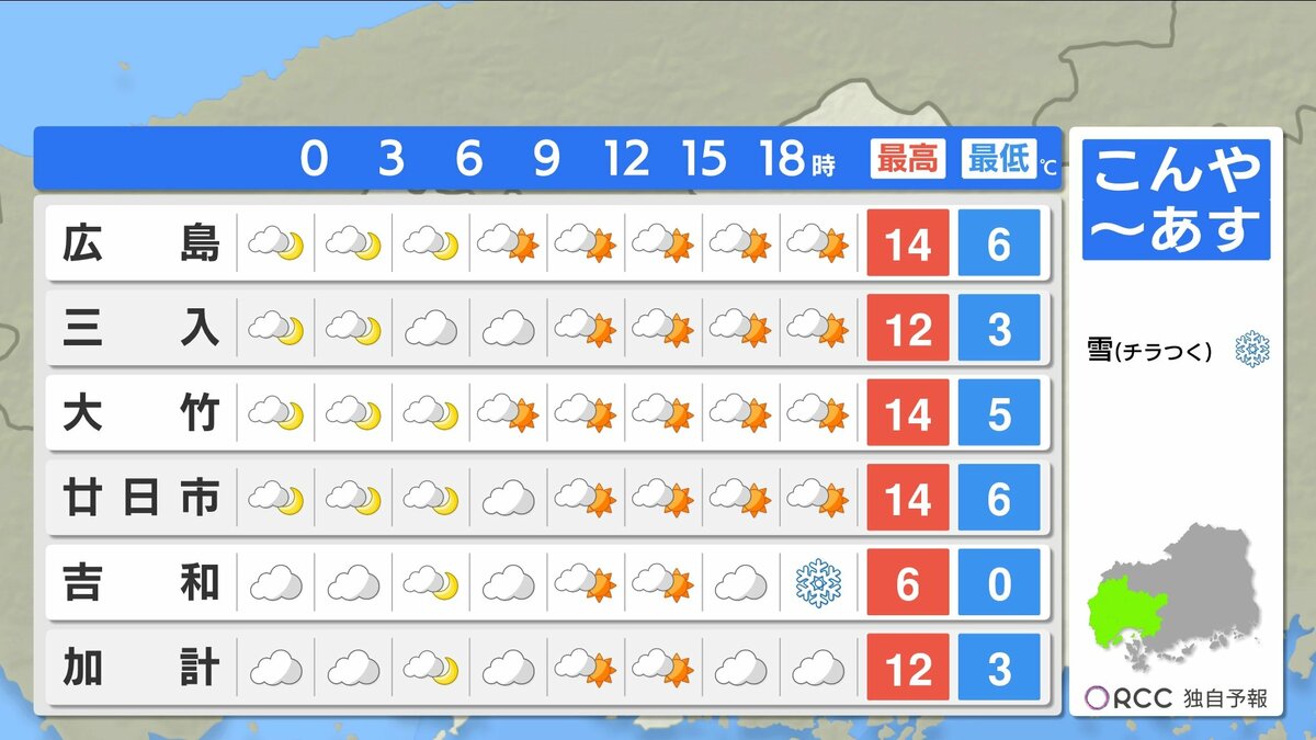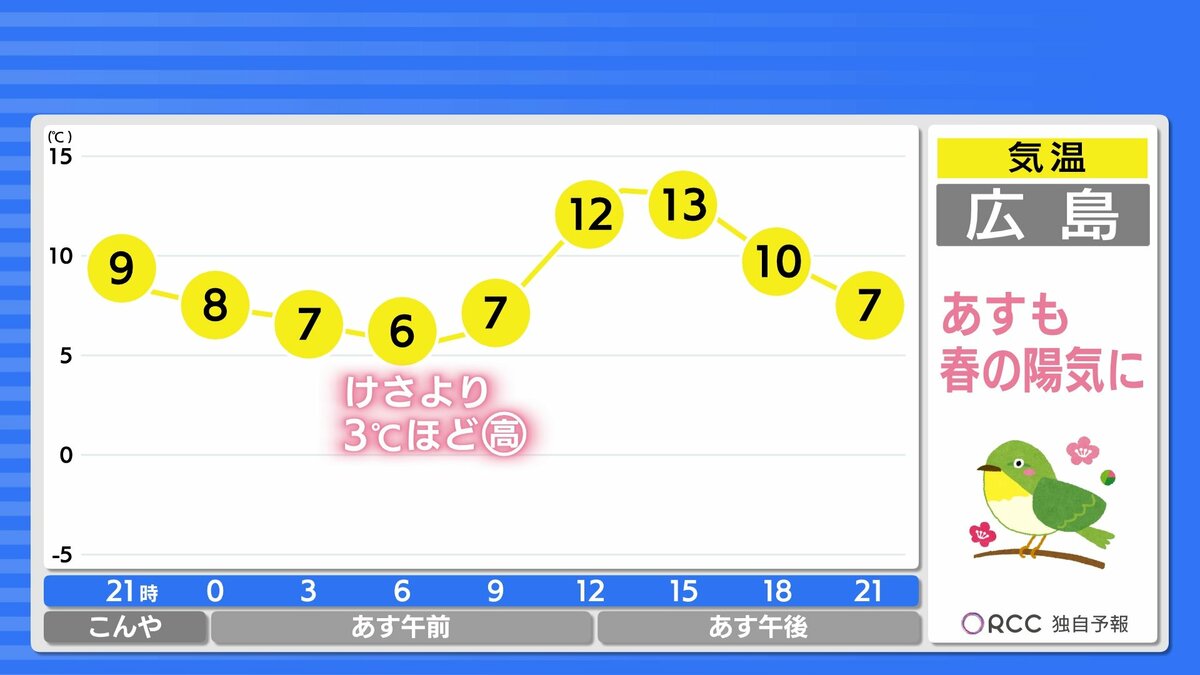 あす朝の冷え込みはさらに緩み、沿岸部で5℃前後でしょう。日中の気温は沿岸部で13℃~14℃くらいで、あすも春の陽気になるでしょう。ただ、午後は次第に寒気が南下し、夜の方が気温が低くなる見込みです。脱ぎ着しやすい服装でお過ごしください。