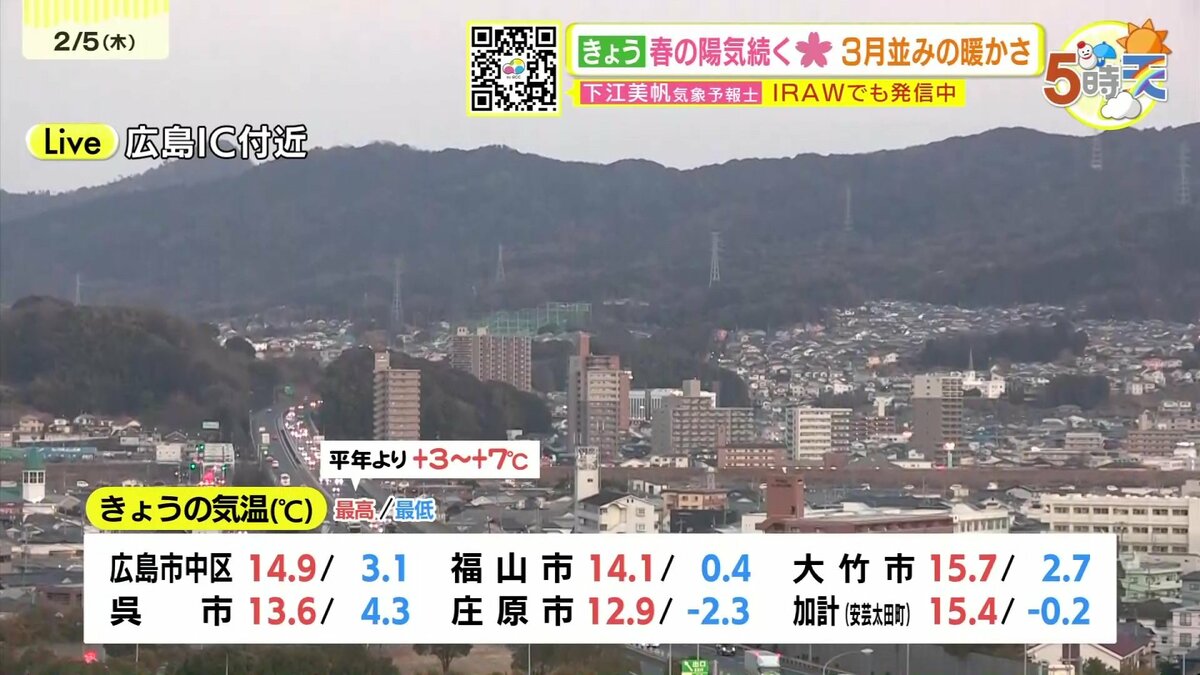きょう2月5日(木)の広島県内は、午後ほど日差しが届き、春のようなぽかぽか陽気になりました。きょうも引き続き各地3月並の暖かさで、最高気温は、広島市中区で14.9℃ 大竹では15.7℃まで上がりました。