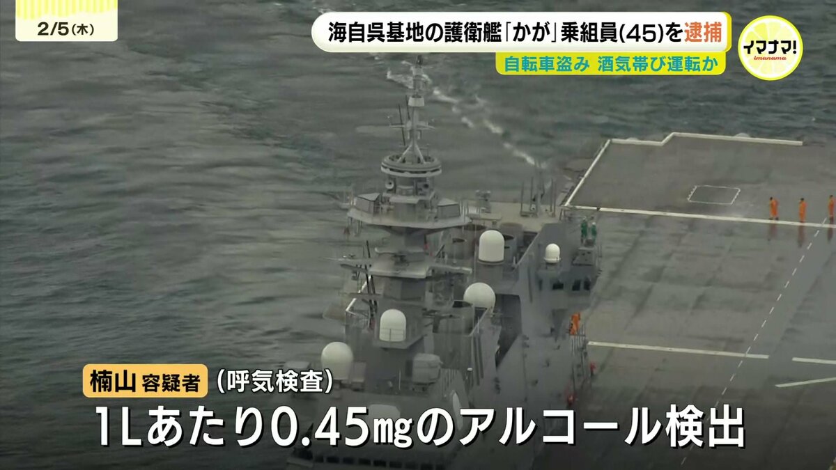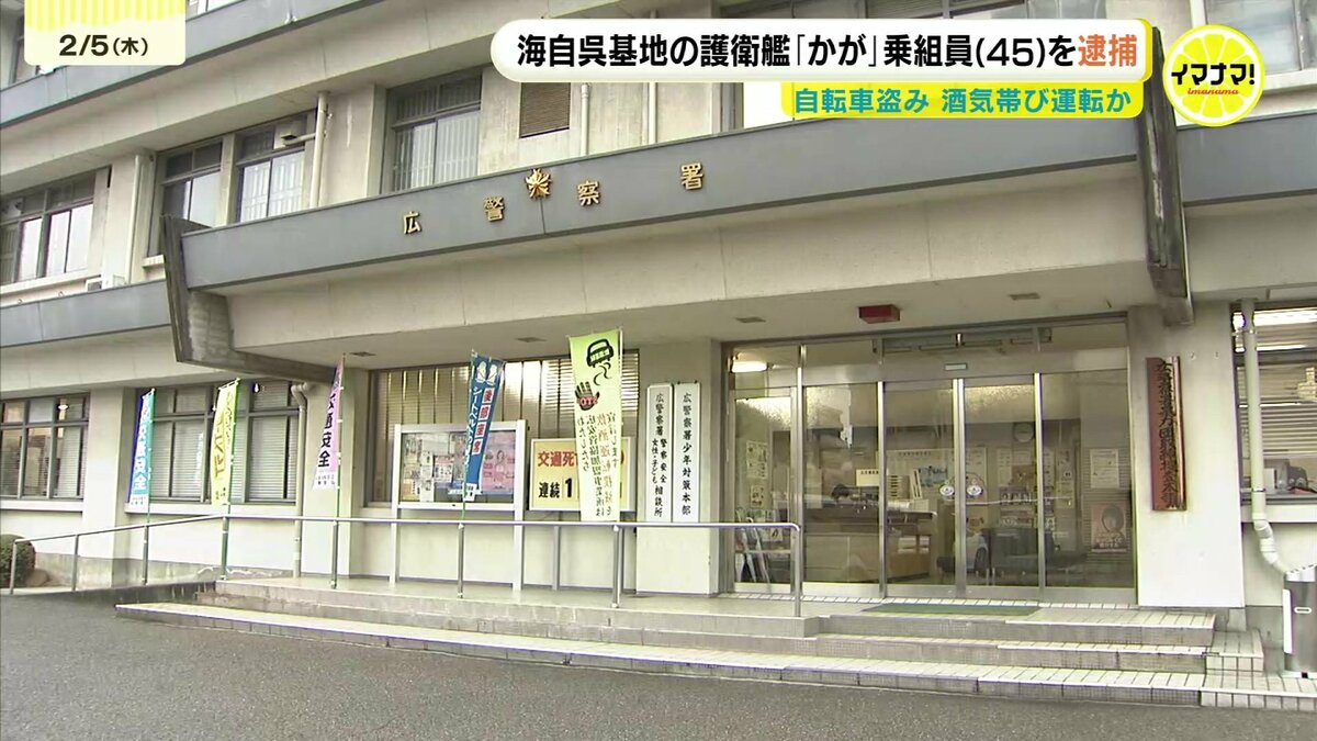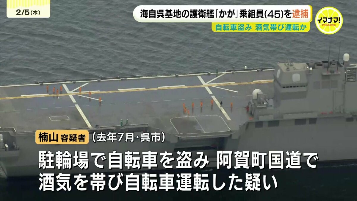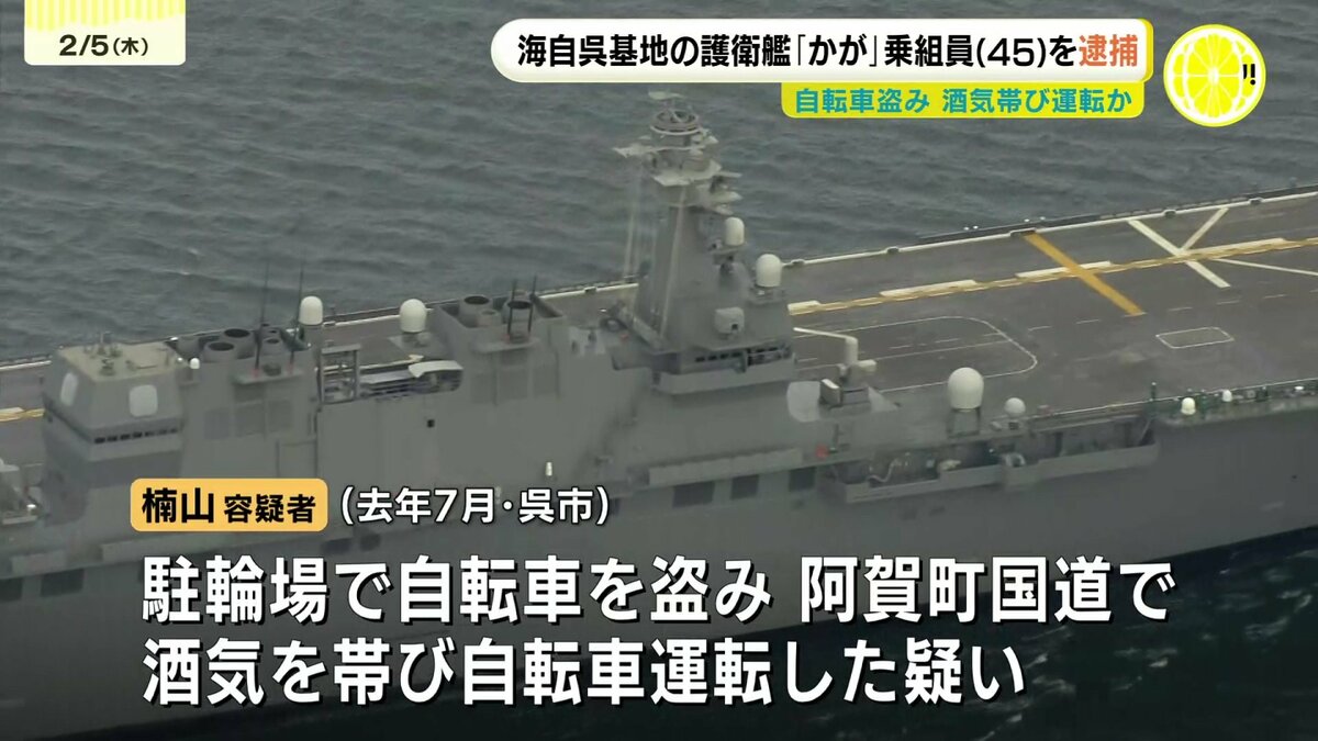 窃盗と道路交通法違反(酒気帯び運転)の疑いで逮捕されたのは、海上自衛隊呉基地の護衛艦「かが」の乗組員、楠山誠也容疑者(45)です。