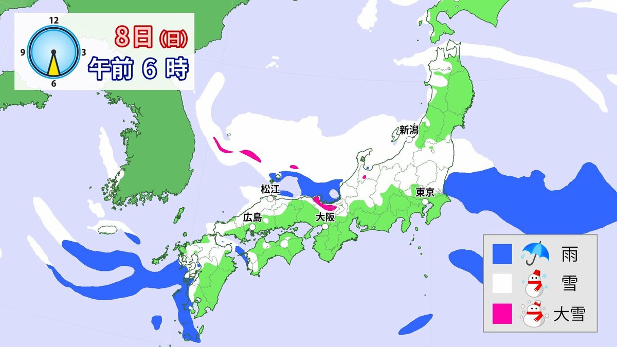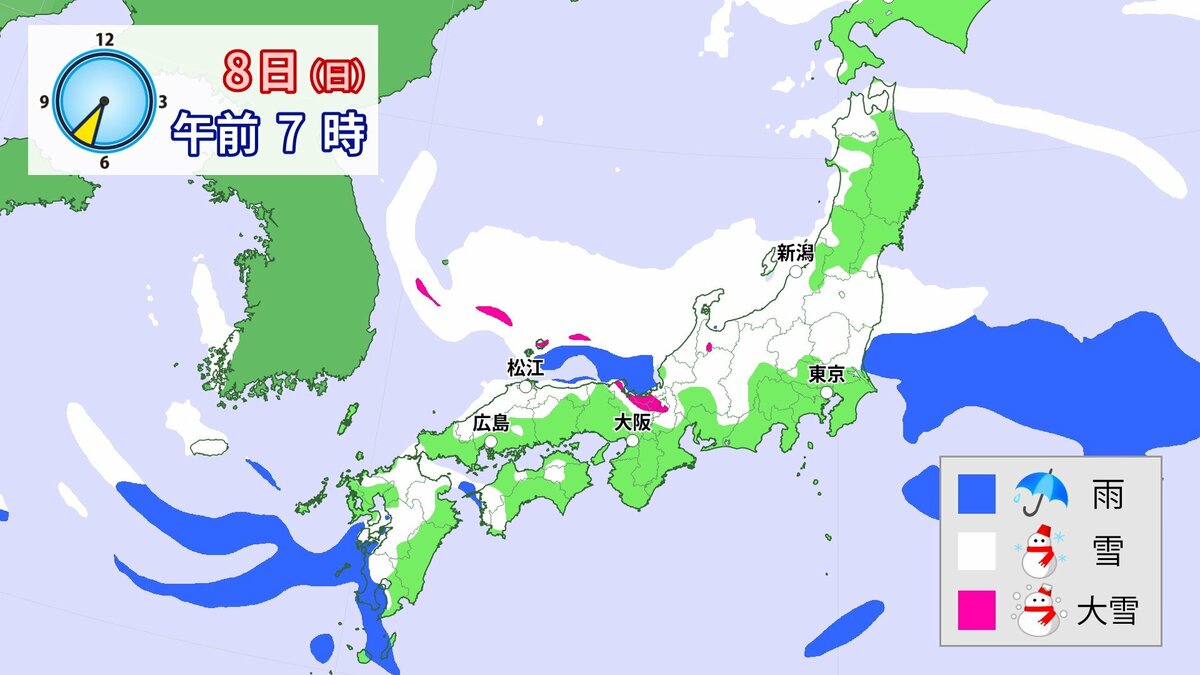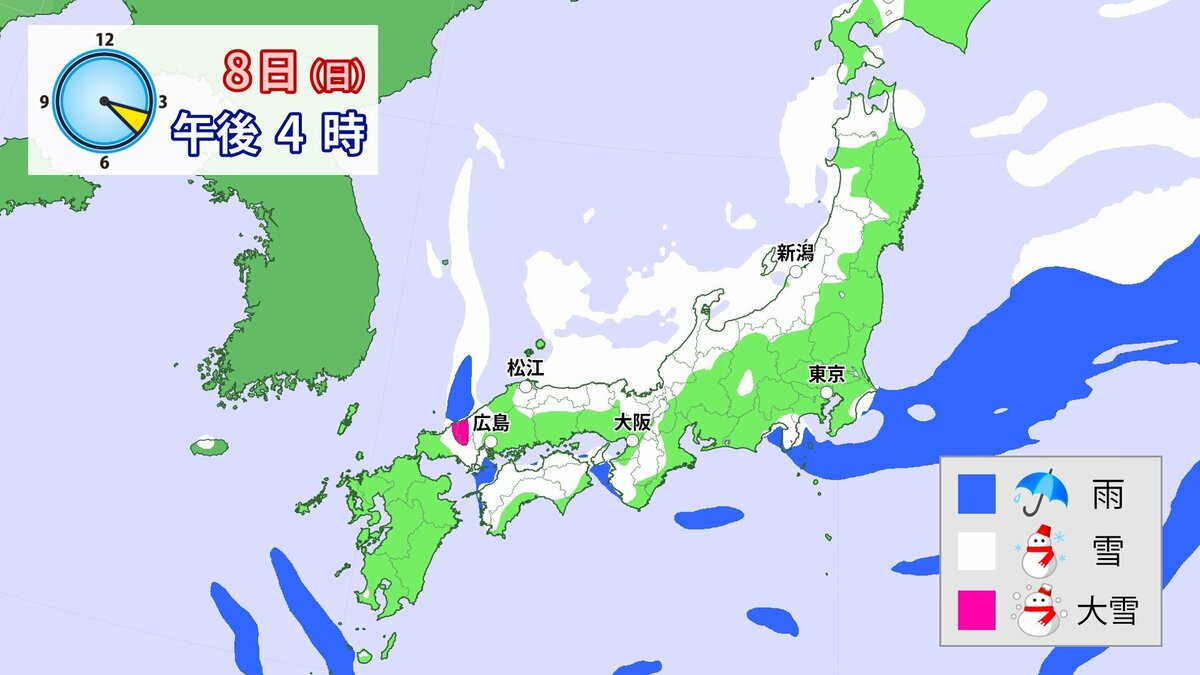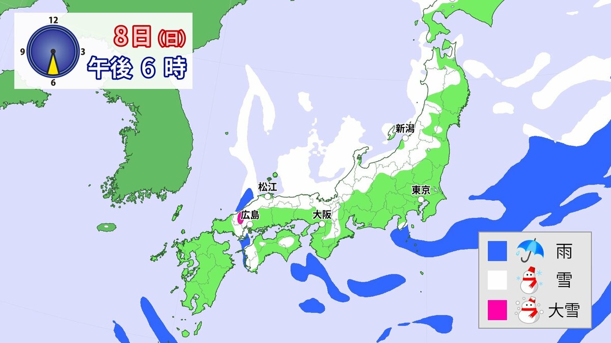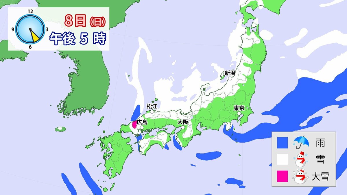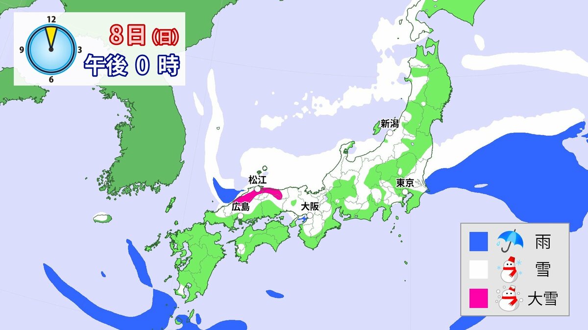 中国地方では、8日は短時間に降雪が強まり、平地も含めた広い範囲で警報級の大雪となる見込みです。