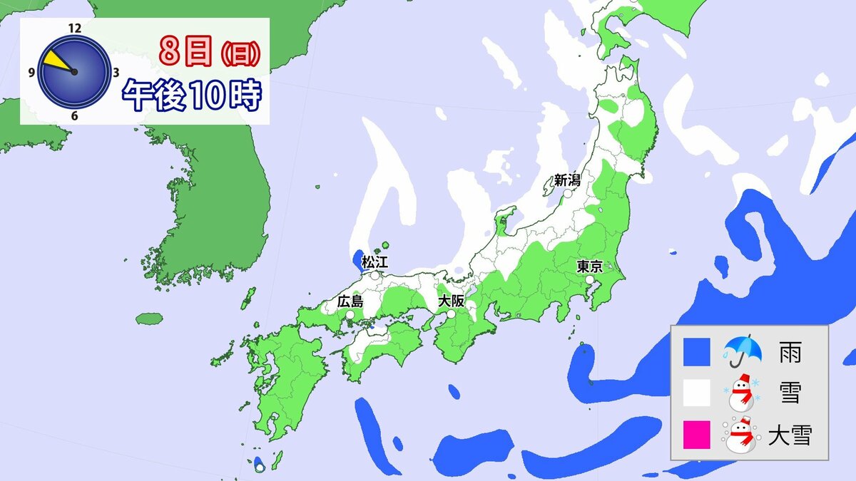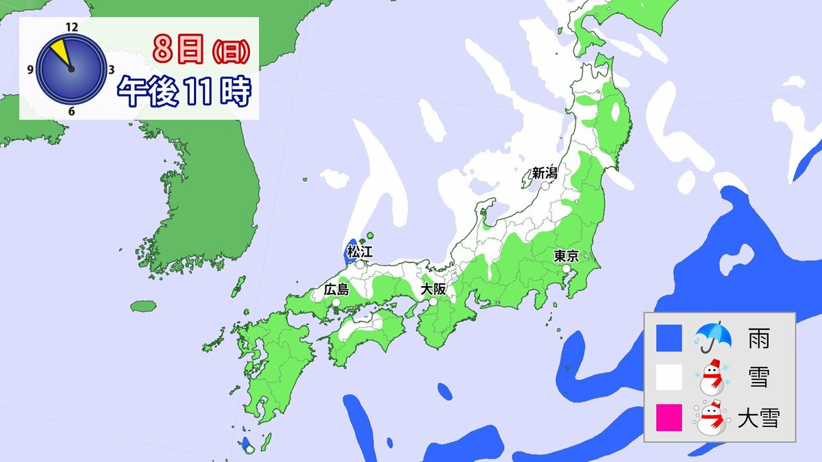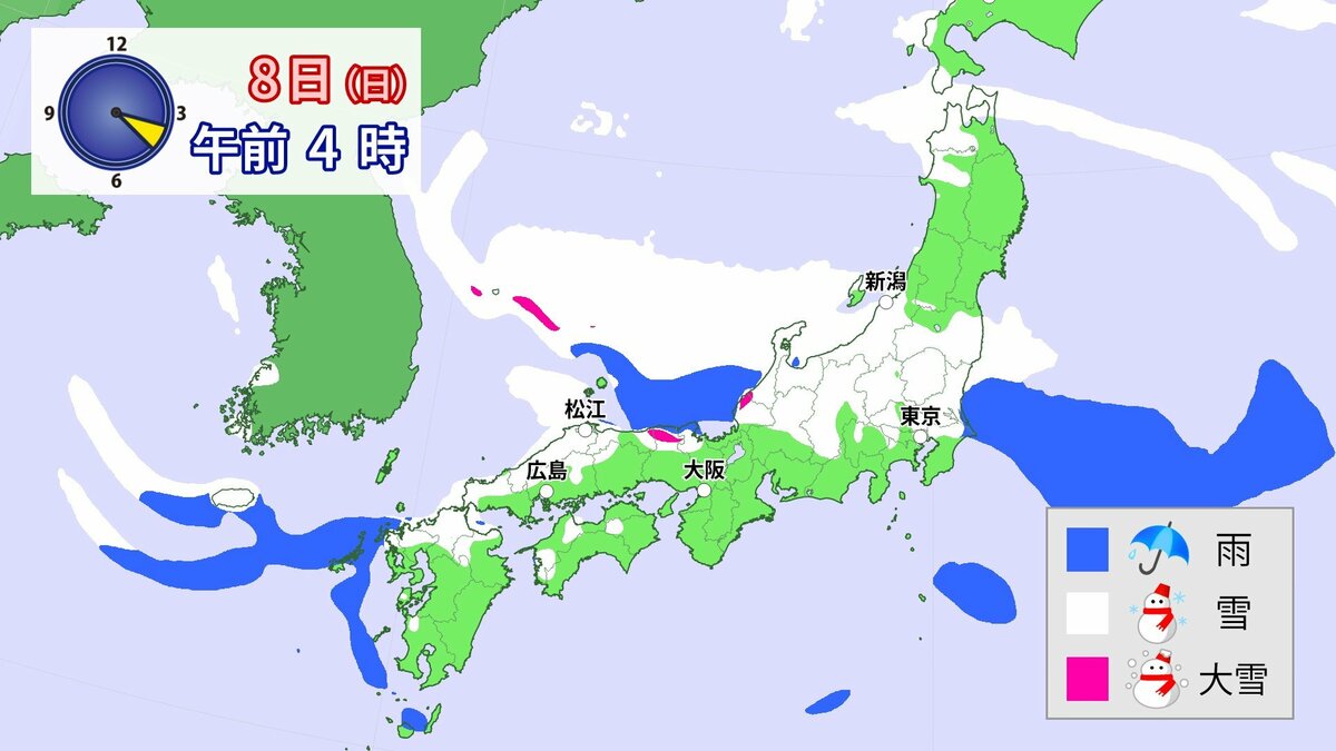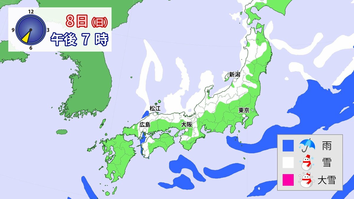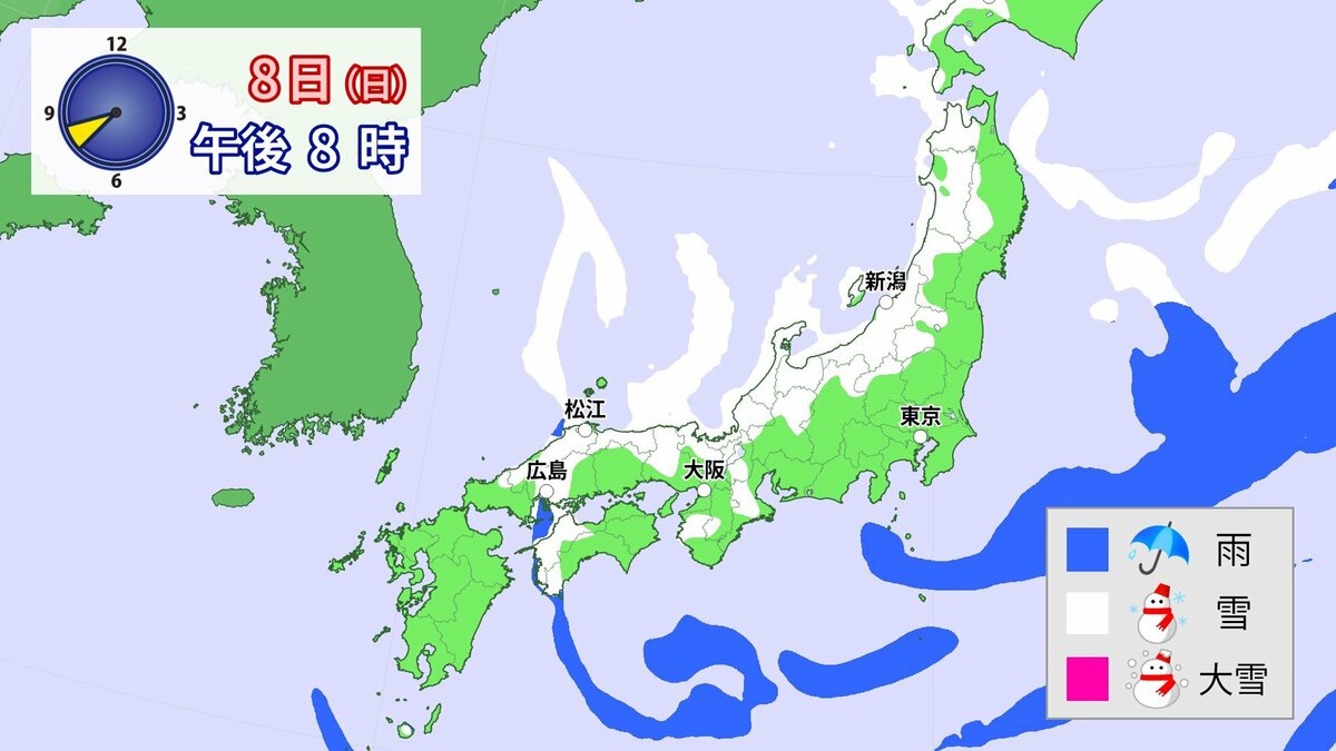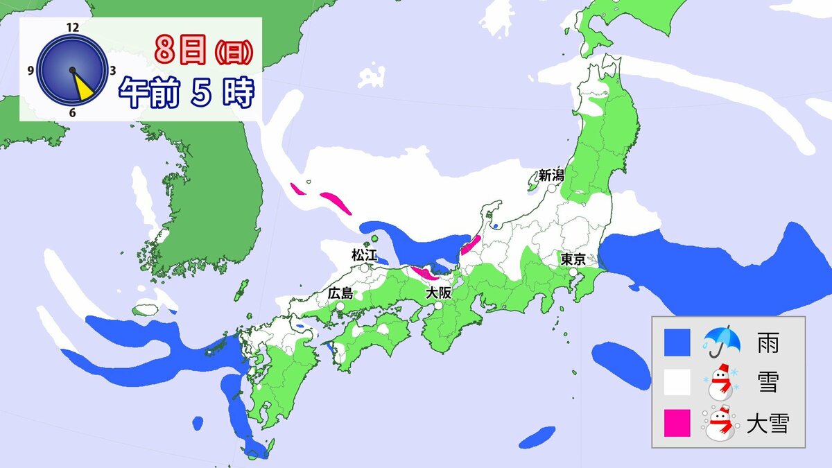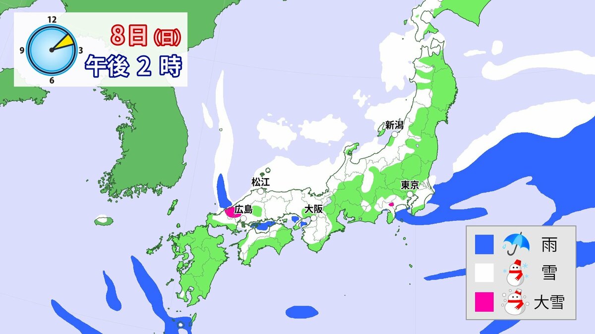 中国地方では、8日は短時間に降雪が強まり、平地も含めた広い範囲で警報級の大雪となる見込みです。