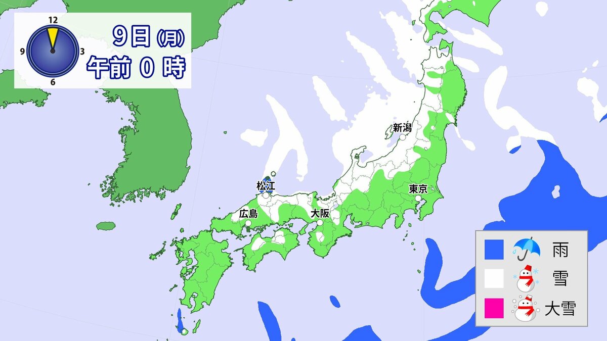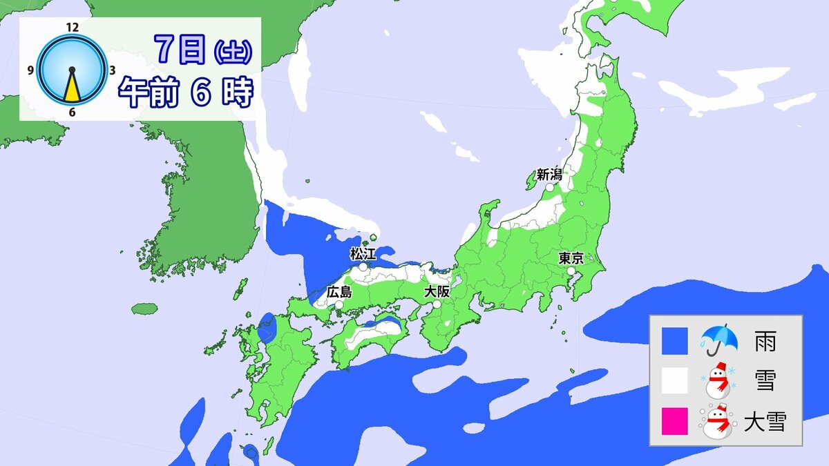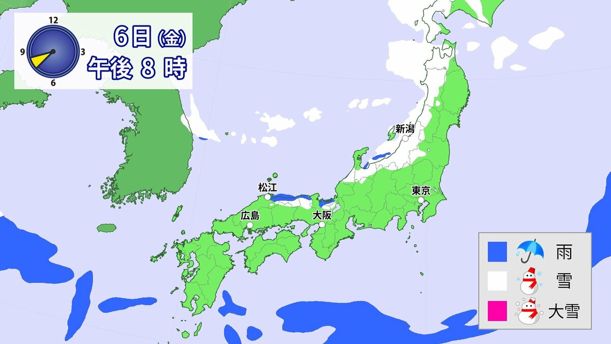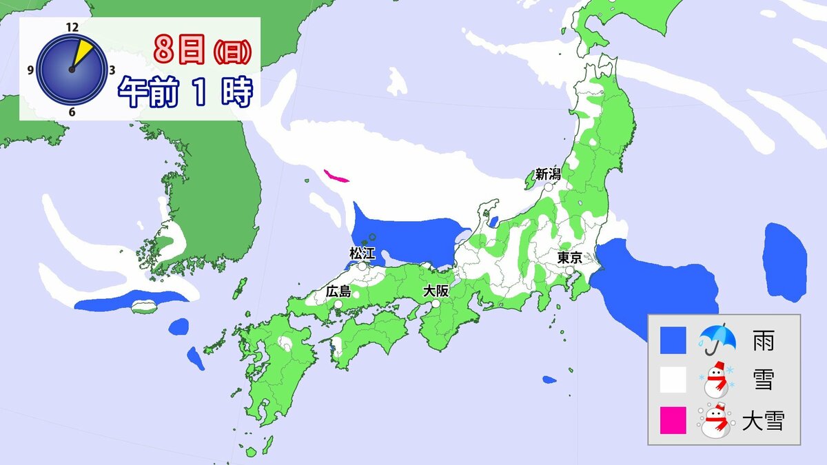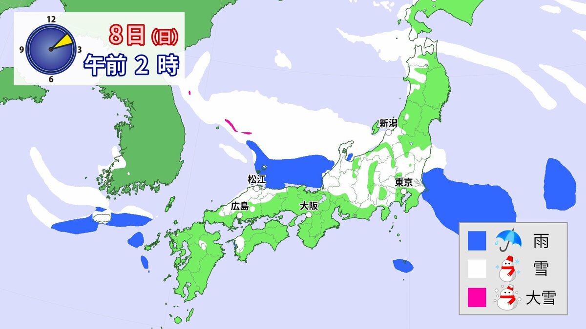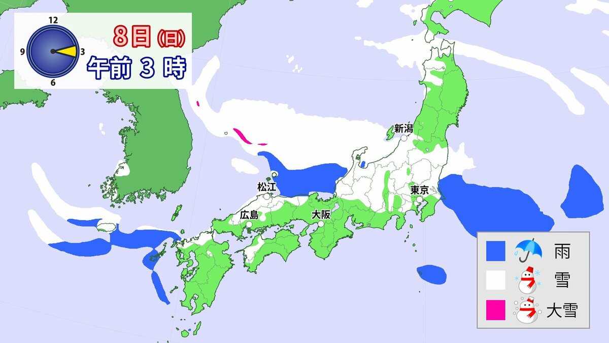 中国地方では、8日は短時間に降雪が強まり、平地も含めた広い範囲で警報級の大雪となる見込みです。
