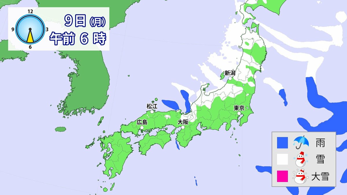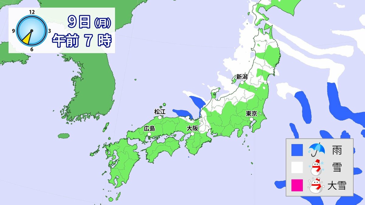 冬型の気圧配置は、9日頃には西日本から次第に緩みますが、北日本から東日本では寒気の影響で降雪が続き、積雪がさらに増える所があるでしょう。